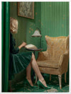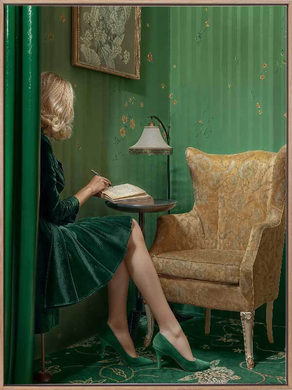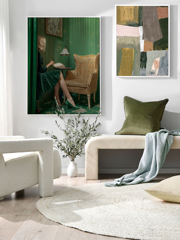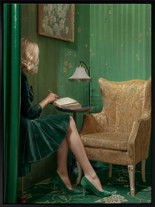 Dear Diary Canvas Art Print - Sitting in her mid-century modern room, packed with art deco vibes, a woman writes in her diary. The bright green shades, juxtaposed by golden yellow tones, gives this retro wall art a sense of serene nostalgia. With the charm of a bygone era, this piece is an ideal addition for any bedroom or living room.