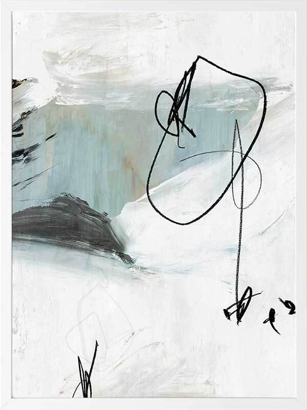 Defined I Framed Art Print - Playful, yet moody, this piece brings a unique feel with interesting linework and an abstract backdrop. A mellow palette of cloudy light blue, soft white, black and grey gives this piece an understated feel, perfect for modern or Scandi interior styles.