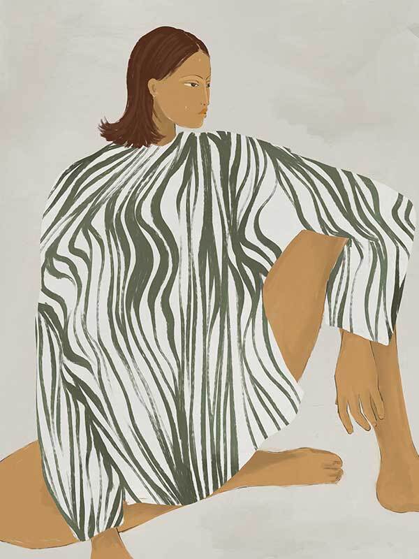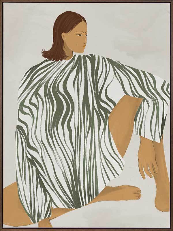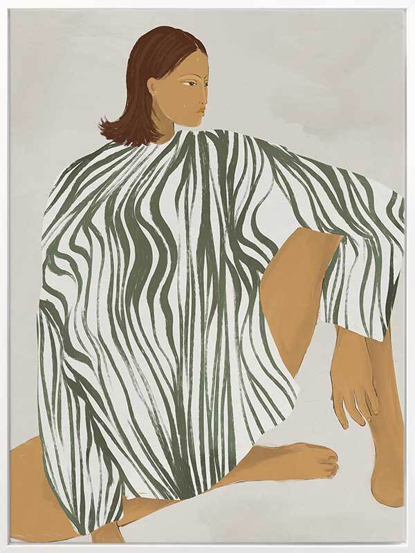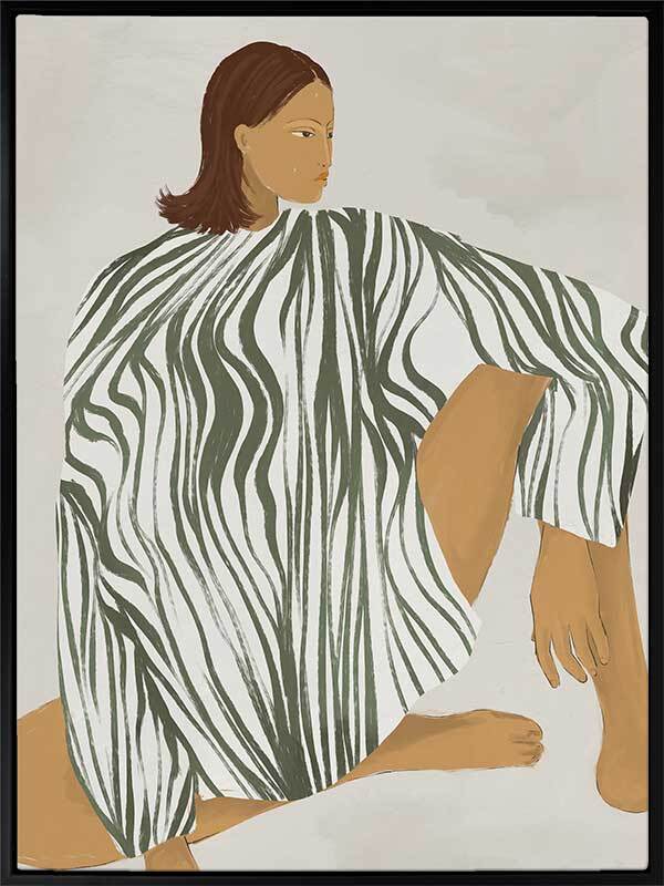 Delilah Daring Canvas Art Print - Delilah Daring exudes confidence and fierce energy, featuring a warm-weather favourite dress with its playful stripe pattern. With such a statement design in the foreground, the palette remains neutral with khaki green, warm brown and stone-grey tones.