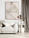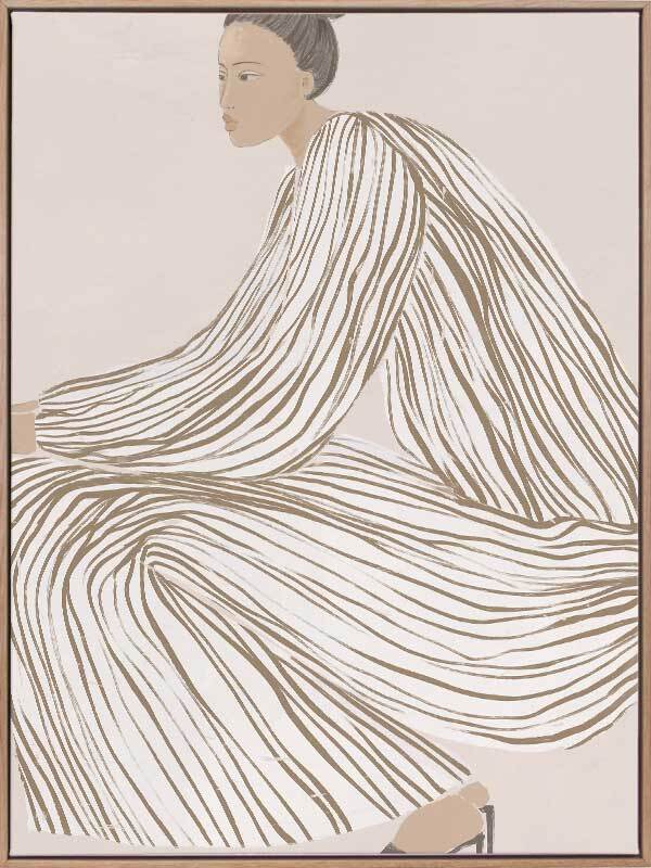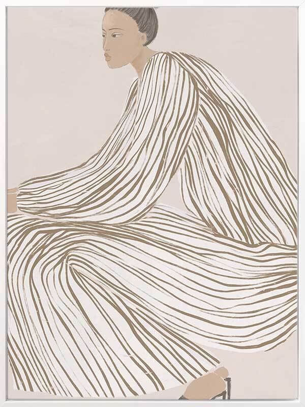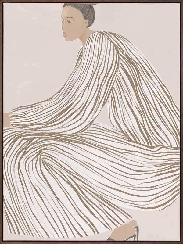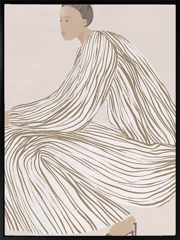 Delilah Dazzling Canvas Art Print - Calm and composed, Delilah Dazzling captures a pensive moment, sitting down, gazing into the distance. A stripped-back palette of neutrals including warm brown, beige, white and black, this artwork displays beautifully in any room as a statement piece.