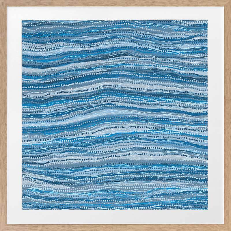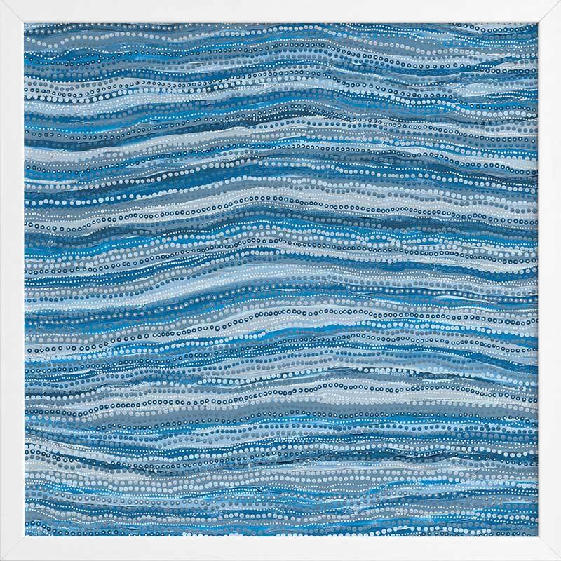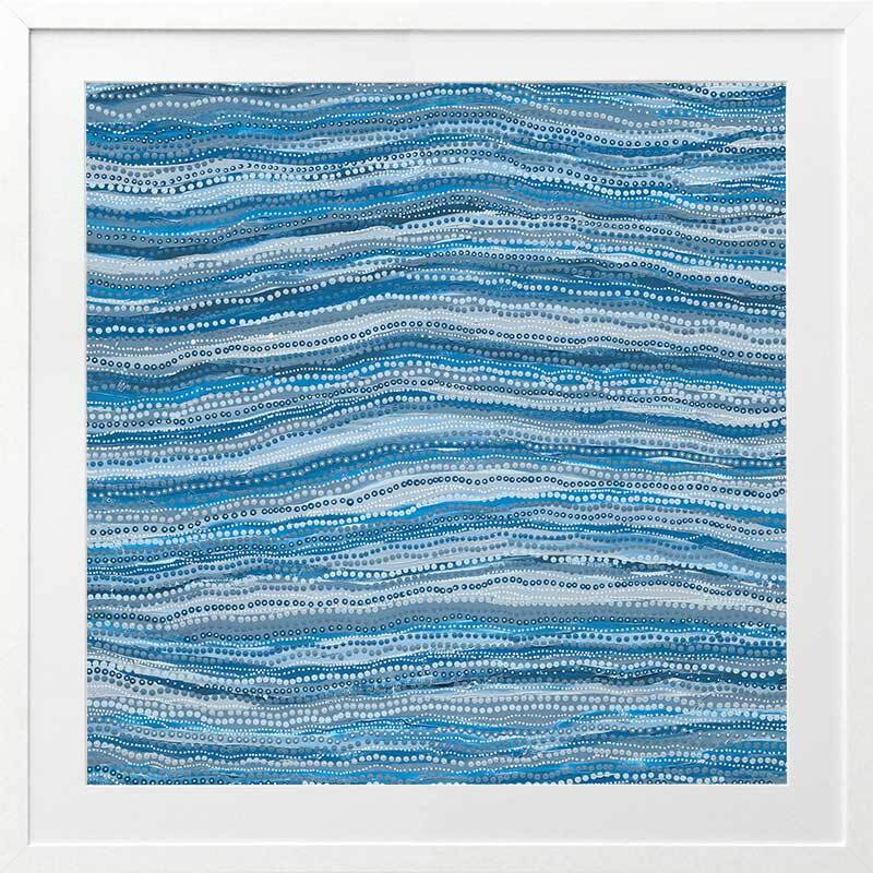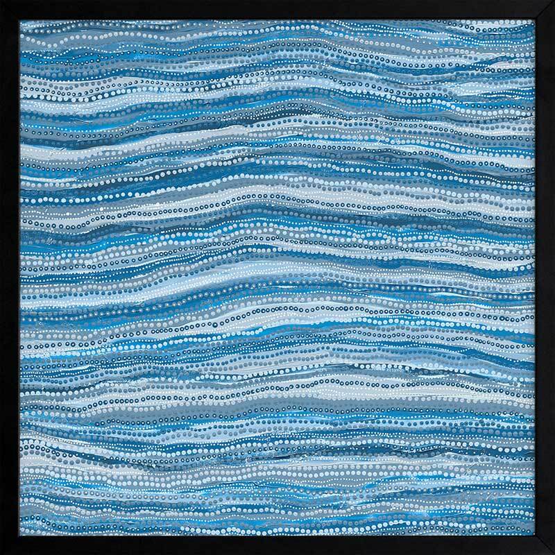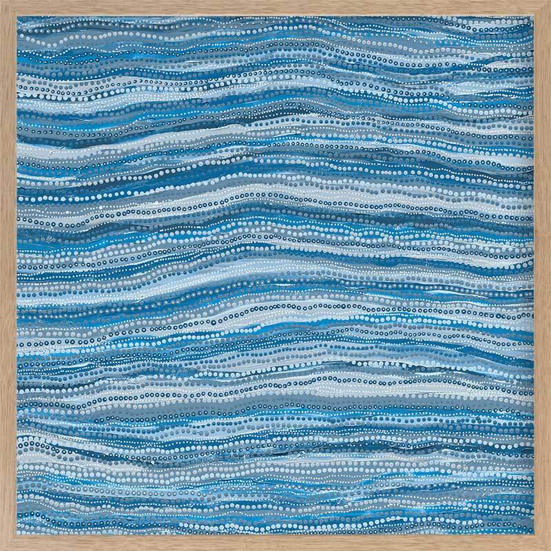 Dhaagun Blue Framed Art Print - This beautiful contemporary piece breathes a sense of rhythm into any room. It focuses on the impact of carefully placed dots in traditional Indigenous Aboriginal works, as they all move in one direction, with a subtle curve in the centre giving it an organic feel. A monochrome palette ranging from ocean to pale blue means this is a versatile piece for most interior design styles.