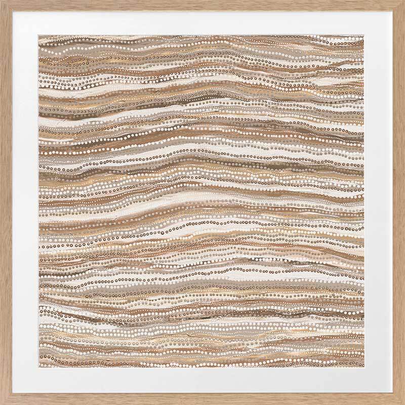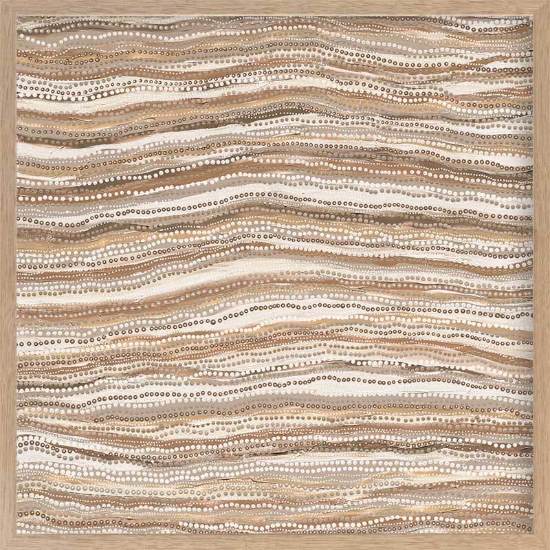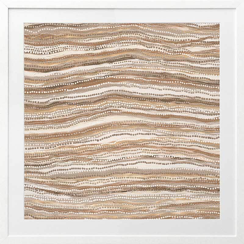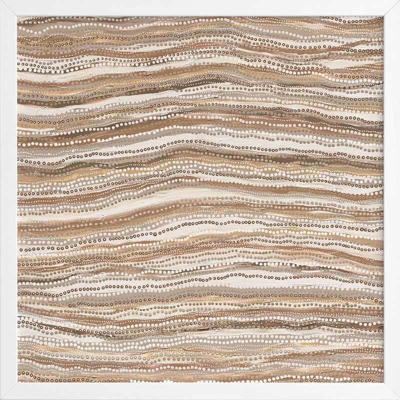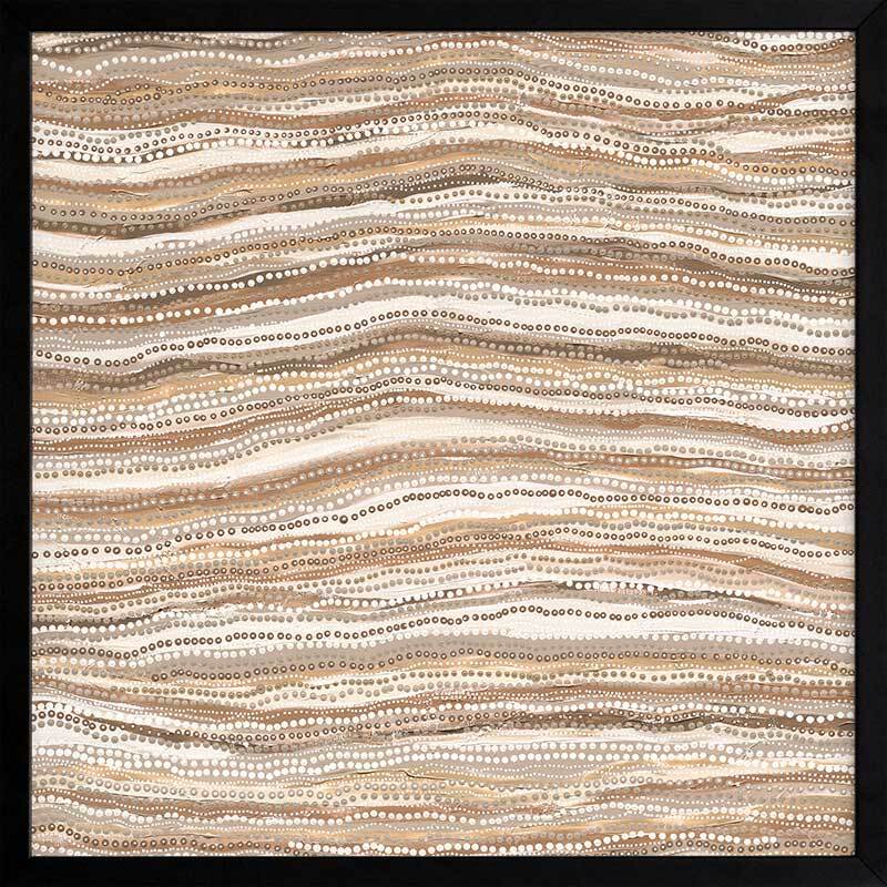 Dhaagun Nude Framed Art Print - This beautiful contemporary piece breathes a sense of rhythm into any room. It focuses on the impact of carefully placed dots in traditional Indigenous Aboriginal works, as they all move in one direction, with a subtle curve in the centre giving it an organic feel. A monochrome palette of tan, beige and darker browns means this is a versatile piece for most interior design styles.