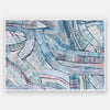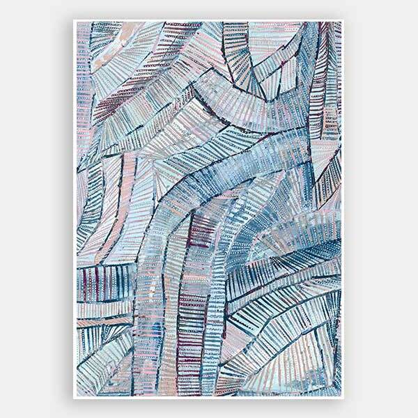 Dhala-bu-nya Bula Blue Unframed Art Print - Sharp and methodical, this labyrinthine contemporary Indigenous Aboriginal piece features ladder like structures weaving and overlapping one another, representative of the earth's cracks and crevices after a drought. Artist Amanda Hinkelmann has used this piece to create a visual metaphor for reluctanct acceptance of support after neglect. The colour palette is cool and muted, featuring dark, murky blue and navy tones highlighted with soft pink, beige and burgundy accents.