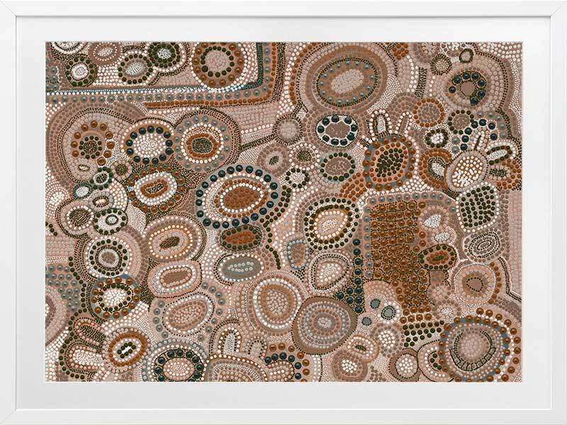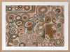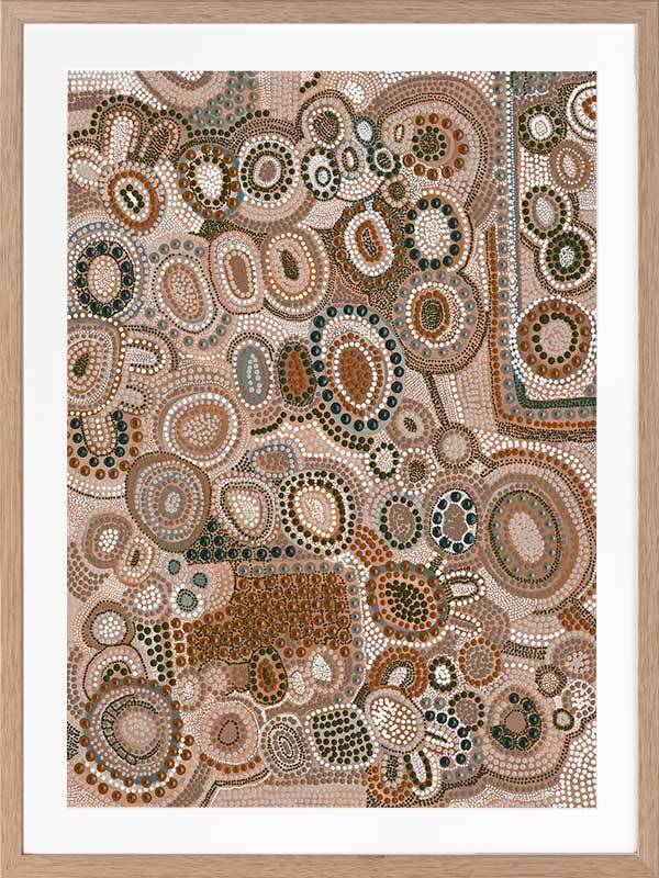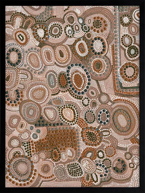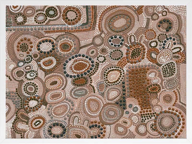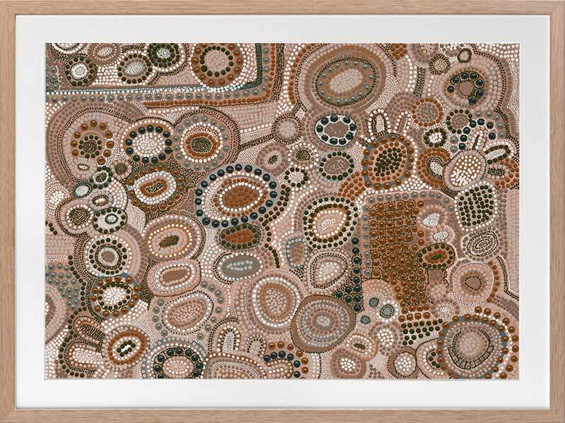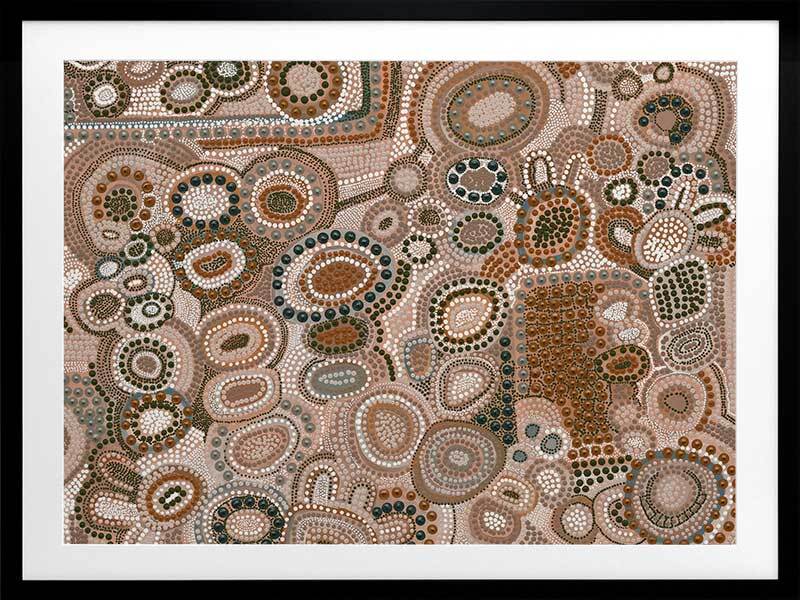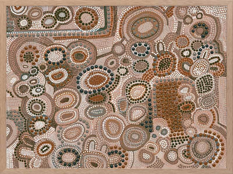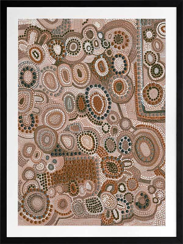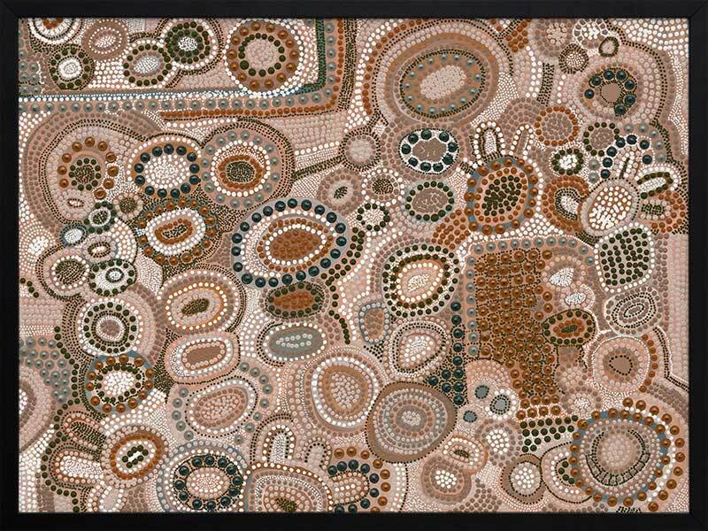 Dharrang Framed Art Print - Warm, earthy and deeply grounded in rich ancestral culture, this contemporary Indigenous Aboriginal artwork has been created by Wiradjuri artist Amanda Hinkelmann. Featuring clusters of intricately painted concentric circles, and colour blocked rectangles, the piece is representative of the Creation period - where all life came into being. The colour palette features a unique blend of brown, beige and deep jade green tones. A complimentary piece to Nganhali, Marramarra and Wiraywinhangin Marramarra, as a part of Amanda's visual representation of the Dreaming.