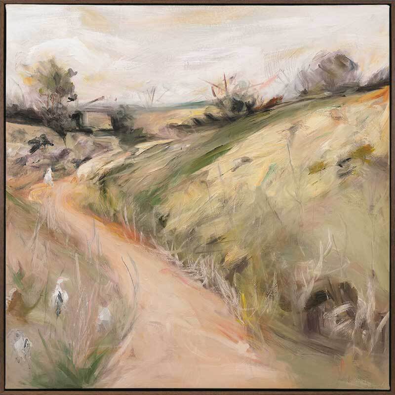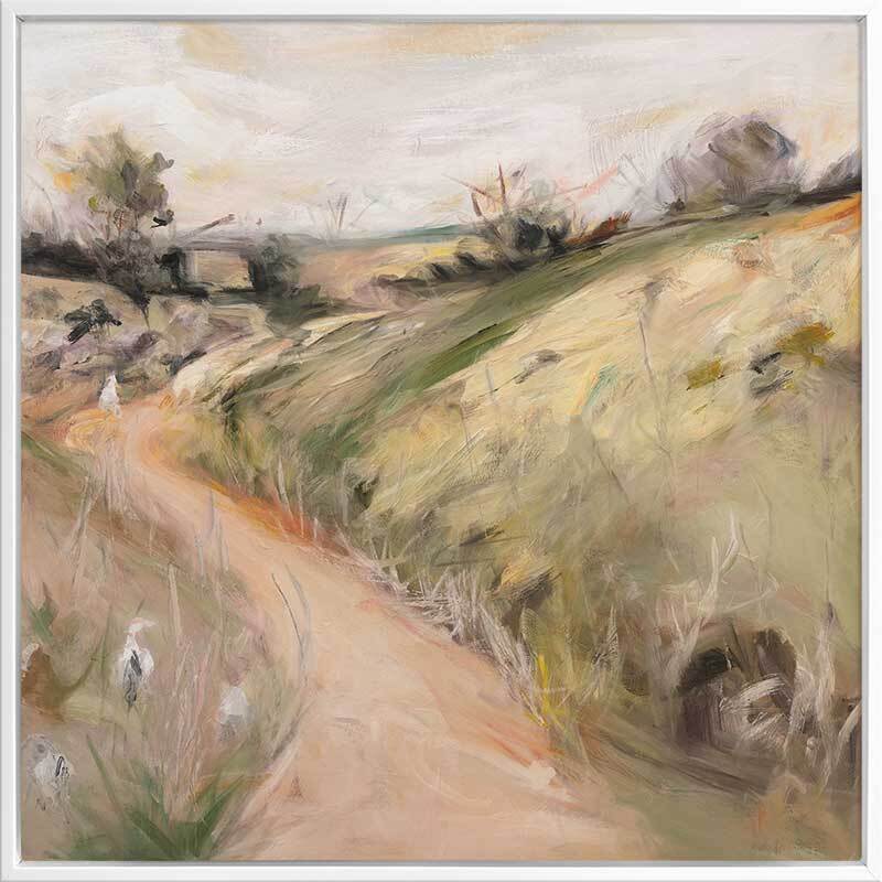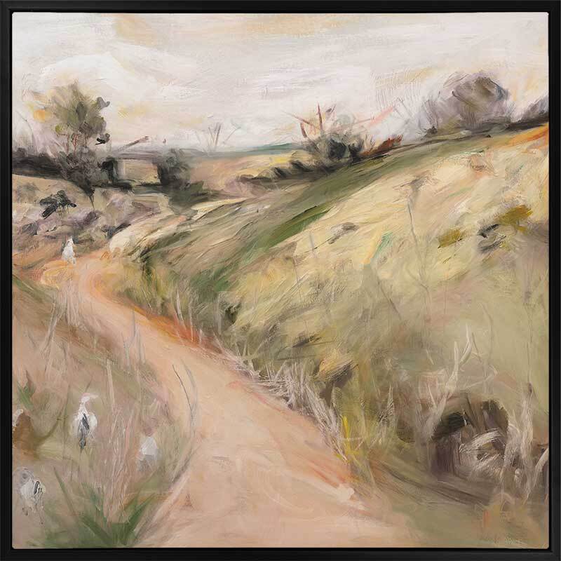 Dirt Road at Dusk Canvas Art Print - This landscape wall art captures the serene beauty of a countryside scene just as evening begins its embrace. The winding trail, painted in earthy tones, guides the viewer's eye through the dreamy terrain. The unruly fields, basked in subtle golden hues, play with the soft greys and gentle whites of the setting sky above. This relaxing piece suits any interior style.