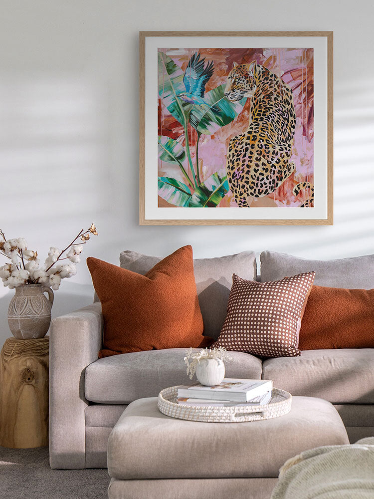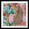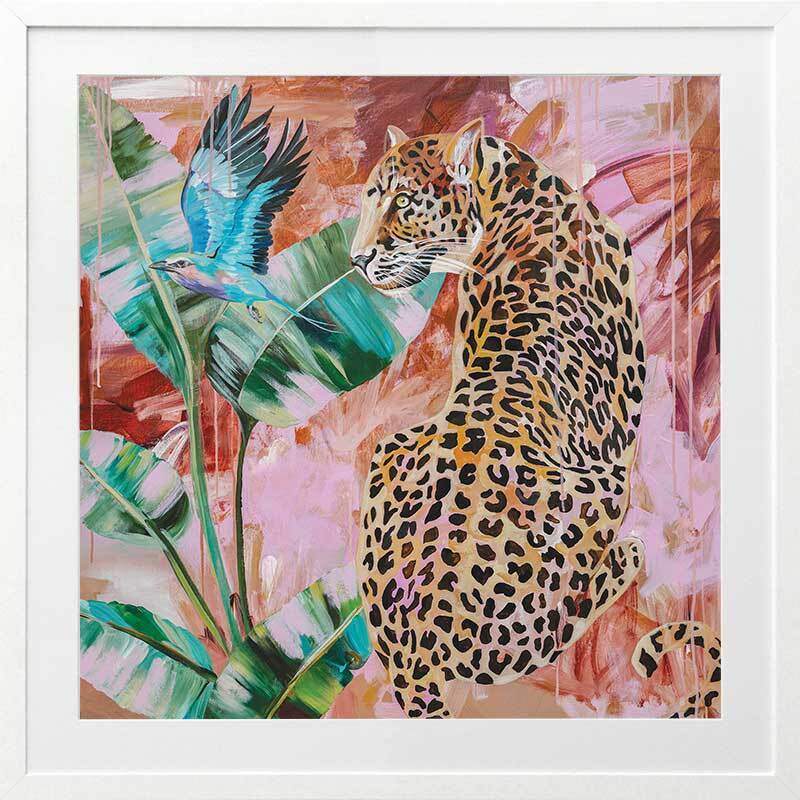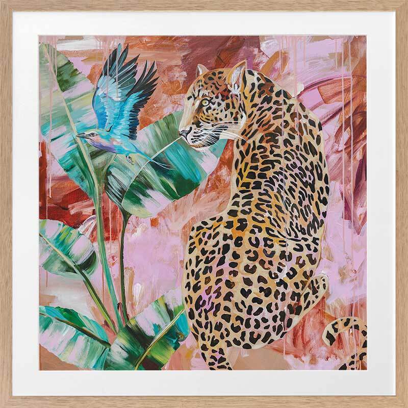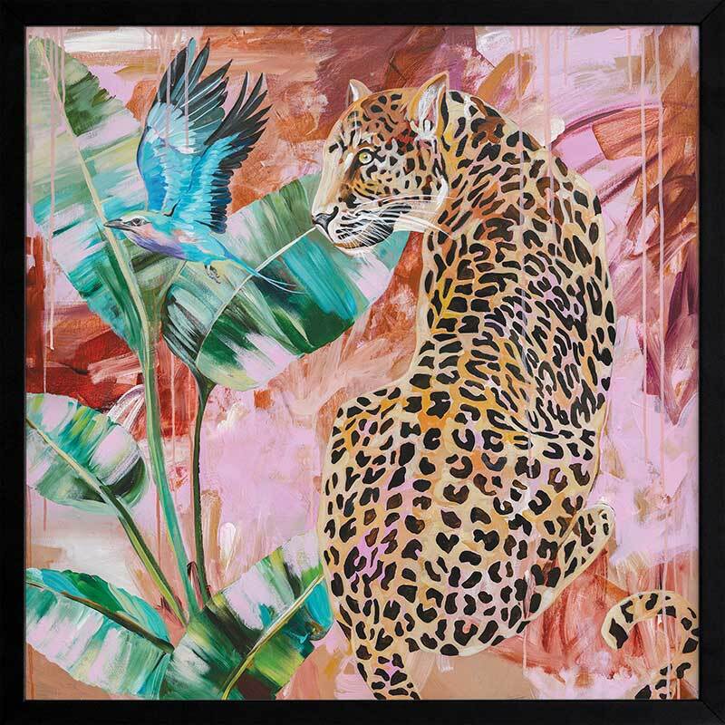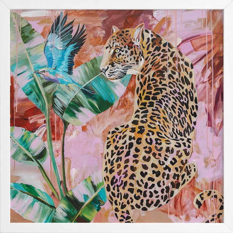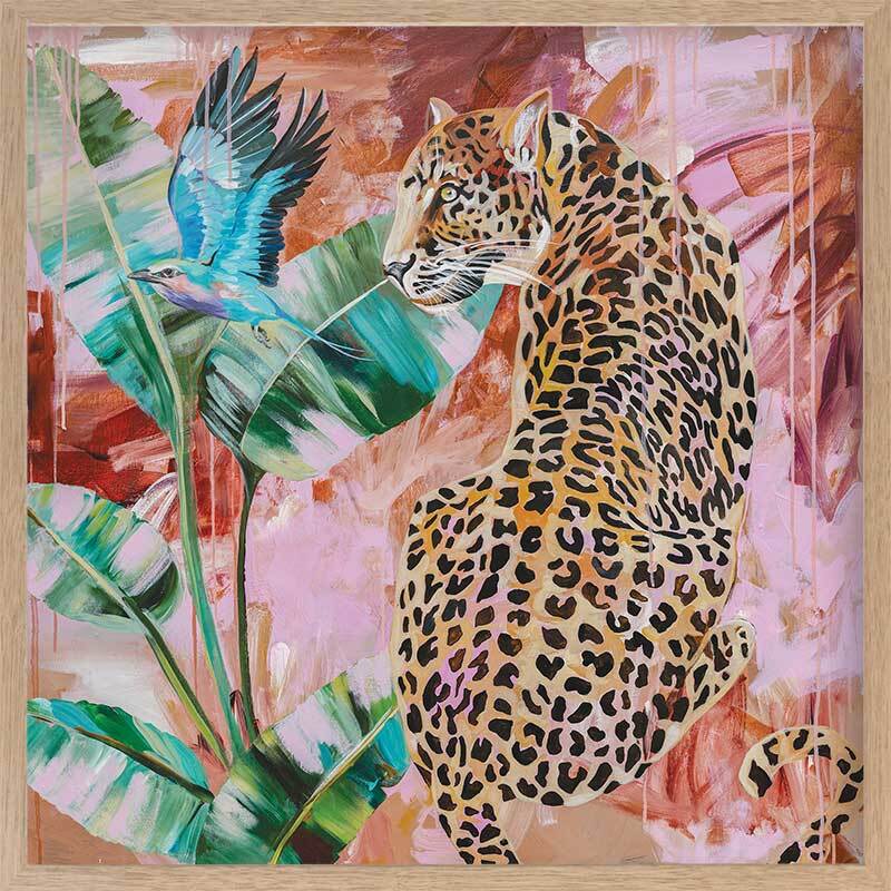 Distant Longing Framed Art Print - Each time this piece catches our eye, we're reminded that leopards are the epitome of strength and grace, with their watchful gaze and powerful energy. The colour palette consists of a melange of warm and cool tones, including bright blue, yellow and green in the foreground, and scattered pinks, burnt orange and tan in the background.