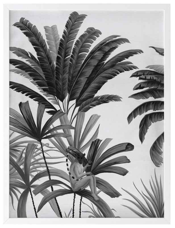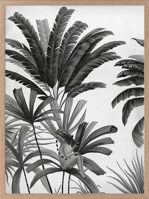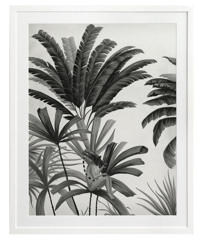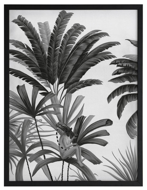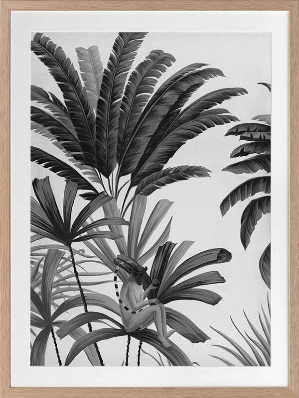 Dominica I Framed Print: Part one of a monotone jungle inspired mural piece featuring dark grey palms, birds and monkeys on a pale grey backdrop. Designed to be displayed as a triptych with Dominica II & III. 2018 AUTUMN/WINTER COLLECTION: CONTINUUM