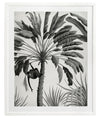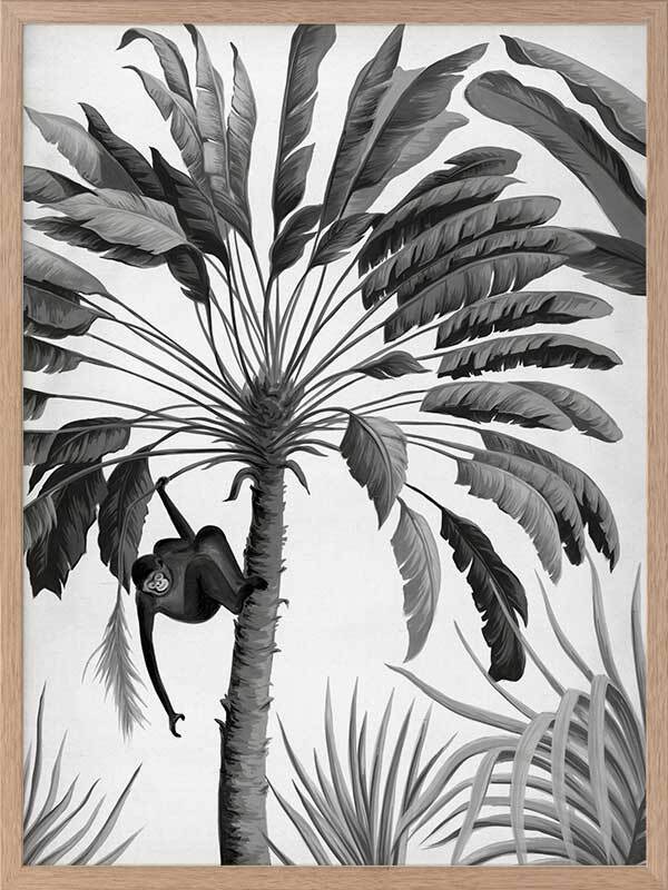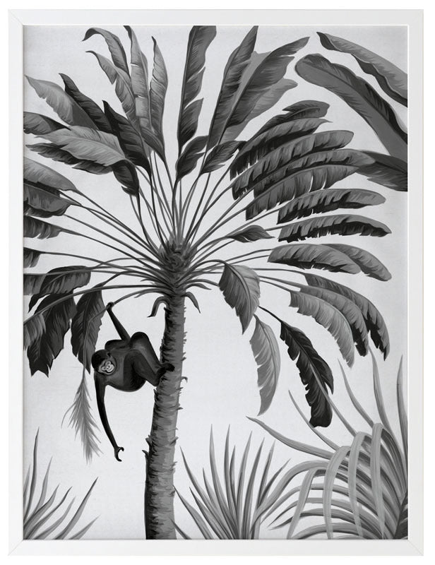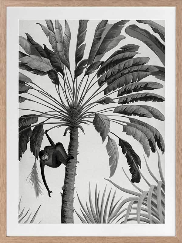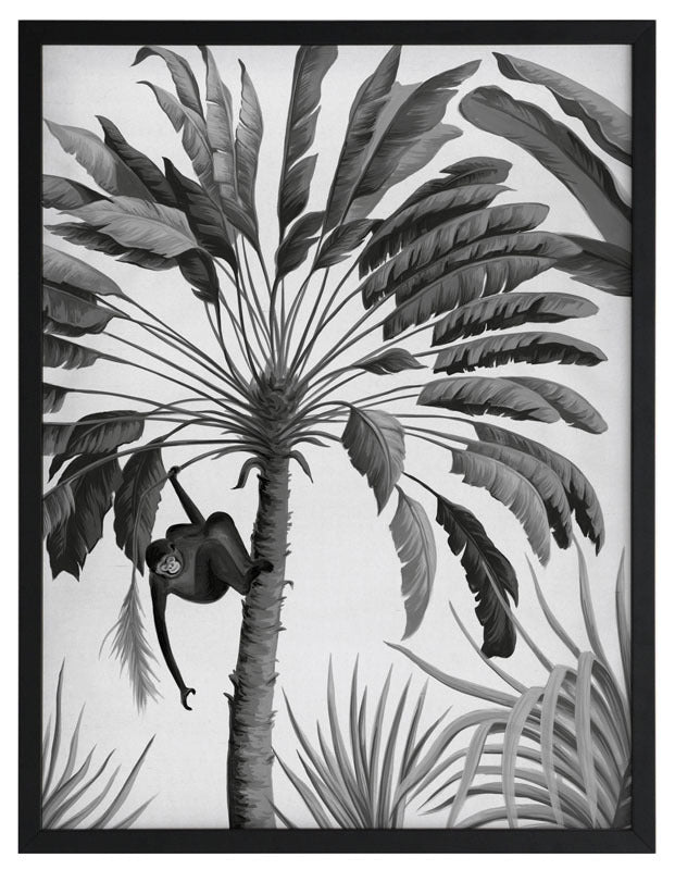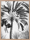Dominica II Framed Print: Part two of a monotone jungle inspired mural piece featuring dark grey palms, birds and monkeys on a pale grey backdrop. Designed to be displayed as a triptych with Dominica I & II. 2018 AUTUMN/WINTER COLLECTION: CONTINUUM