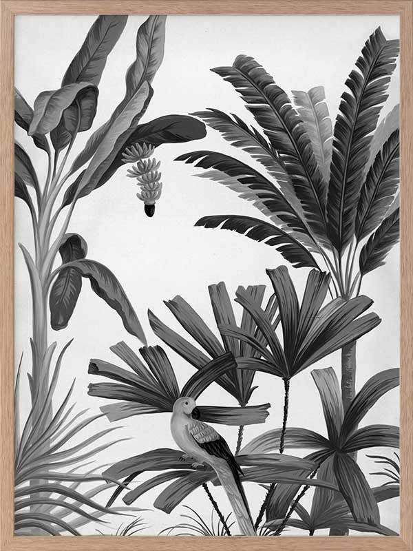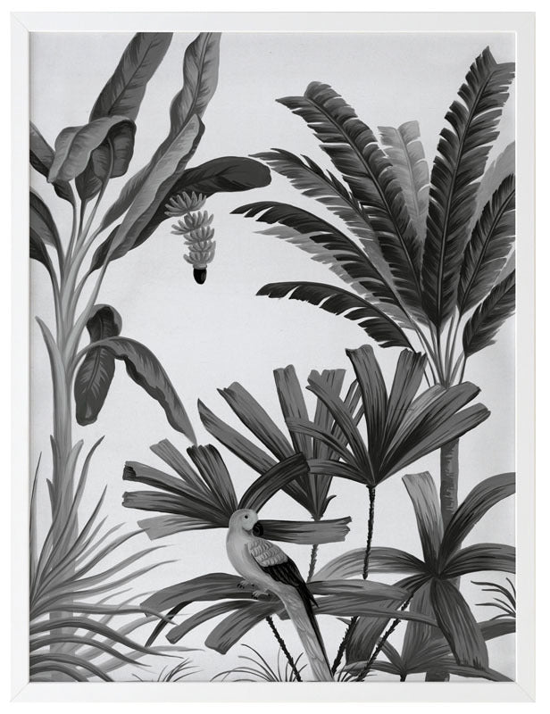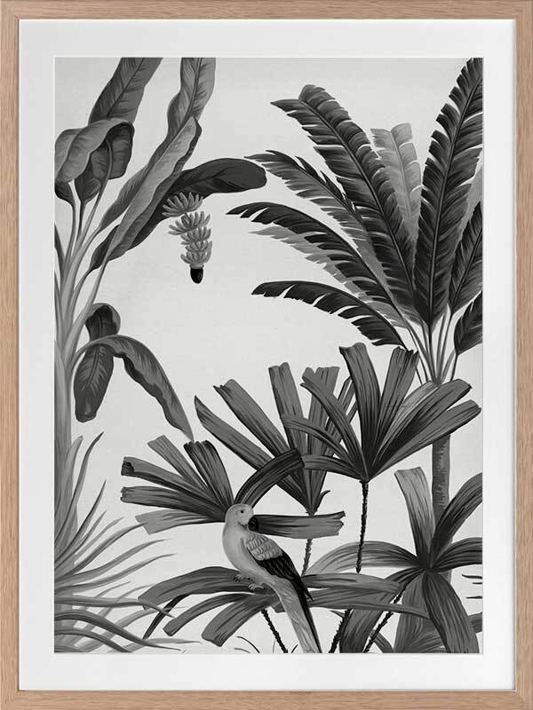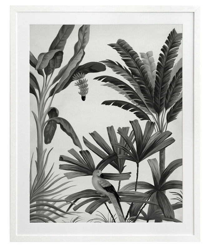Dominica III Framed Print: Part three of a monotone jungle inspired mural piece featuring dark grey palms, birds and monkeys on a pale grey backdrop. Designed to be displayed as a triptych with Dominica I & II. 2018 AUTUMN/WINTER COLLECTION: CONTINUUM