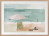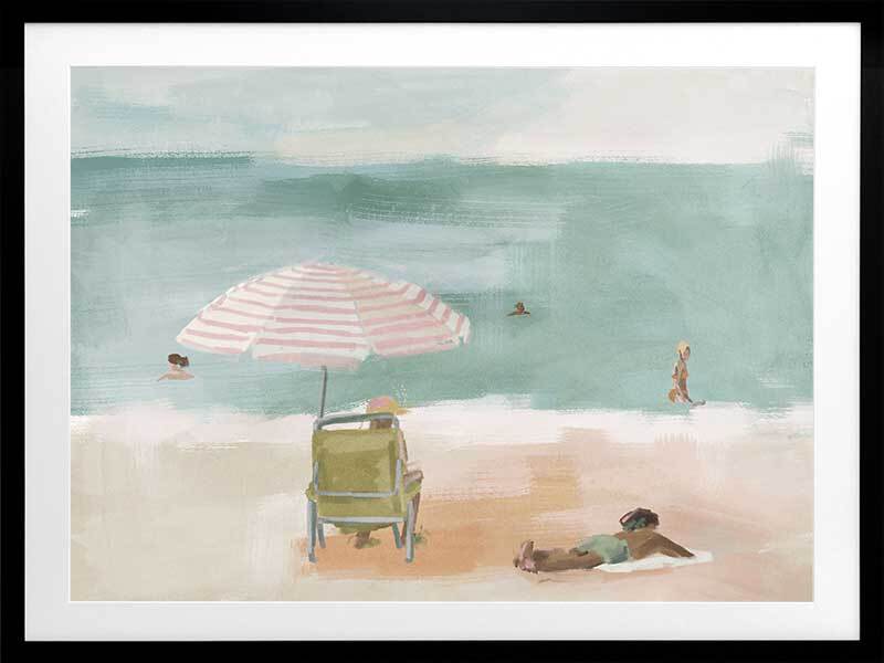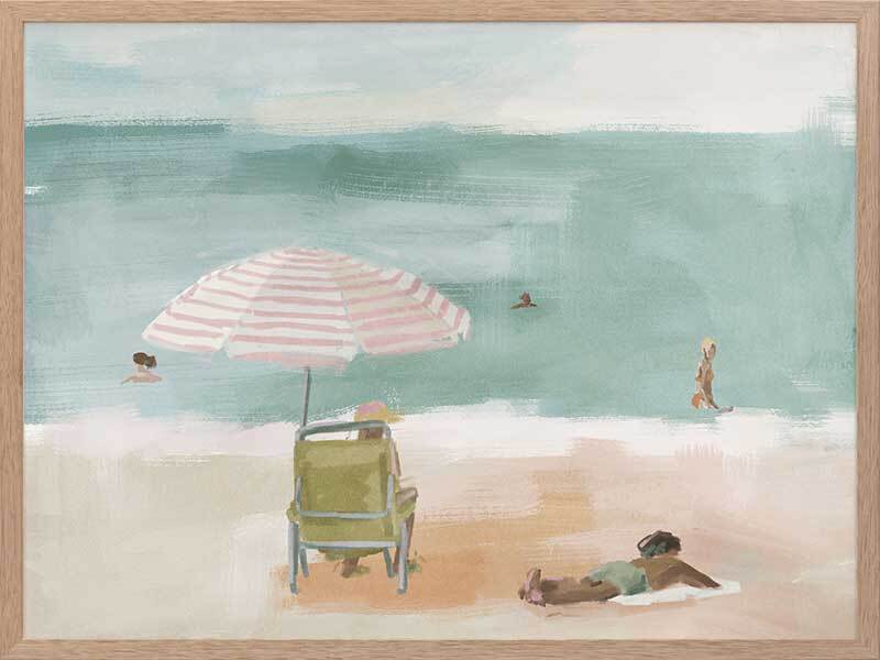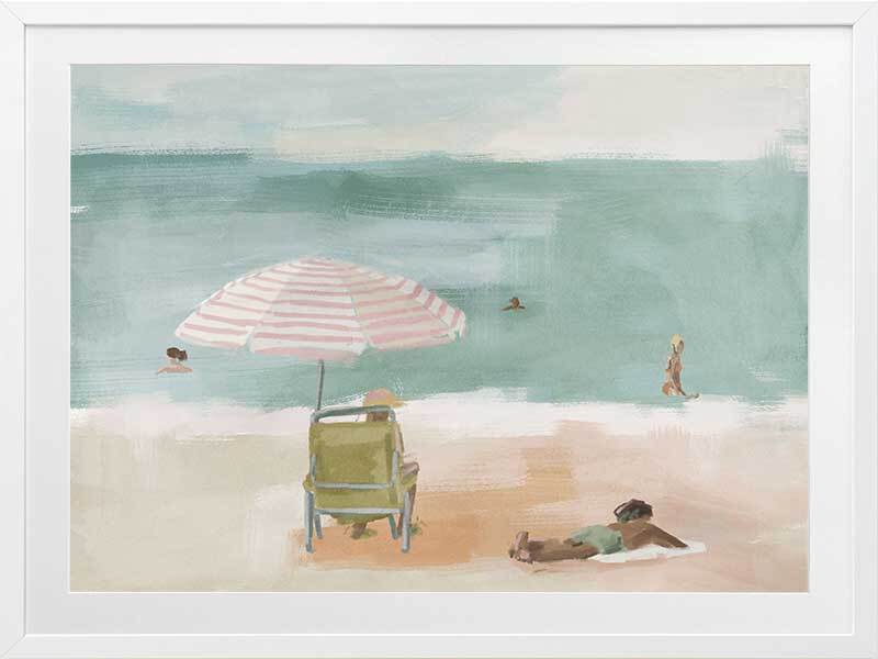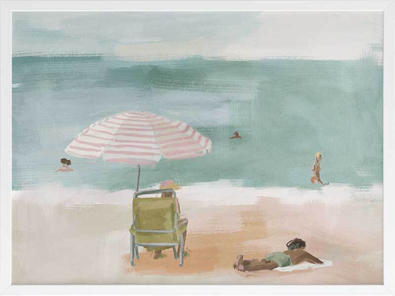 Don't Worry, Be Happy Framed Art Print - Every coastal lover's fantasy, this artwork will have you dreaming of summertime vacations in Europe, basking in the warmth of the sun, listening to the ocean waves. Visible brush strokes and soft blending gives this piece an understated look, with a simple palette of sandy beige, teal blue, and pink.