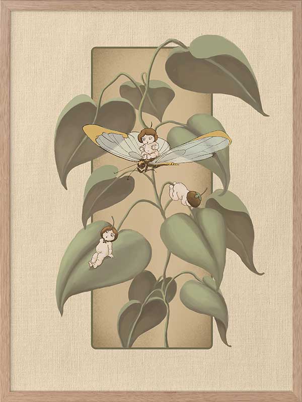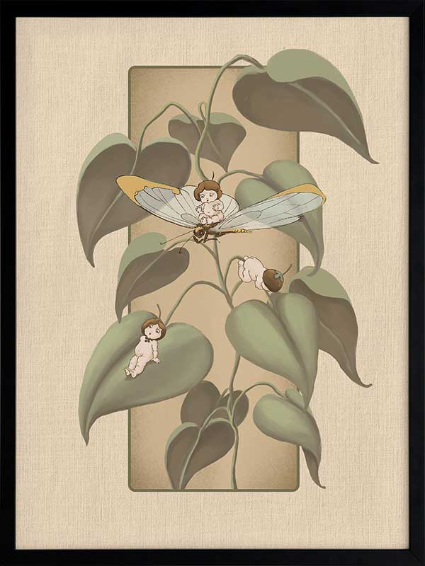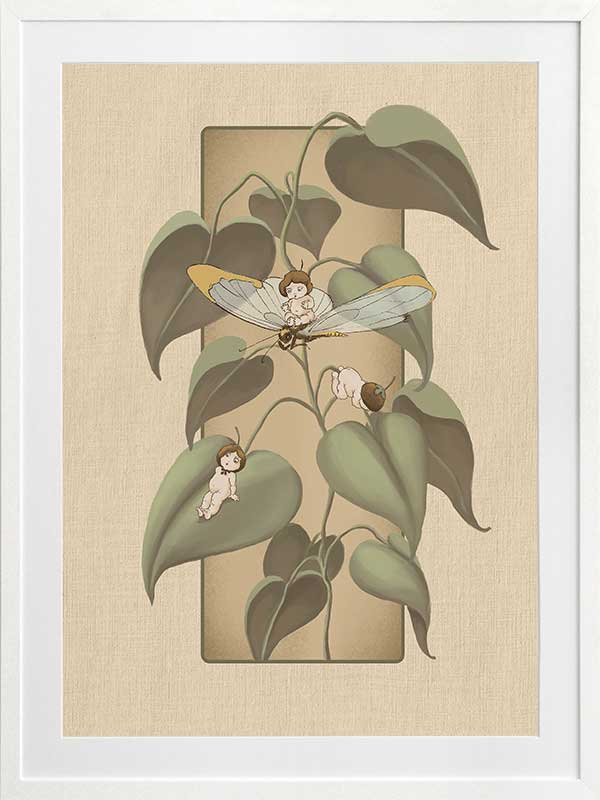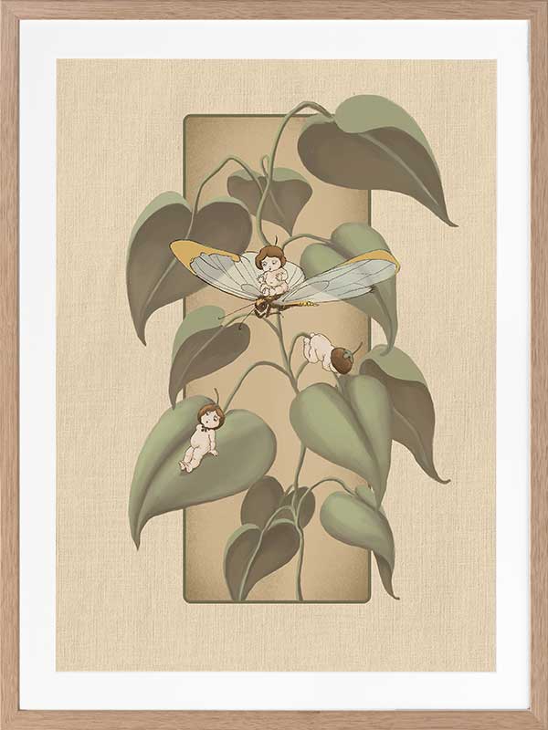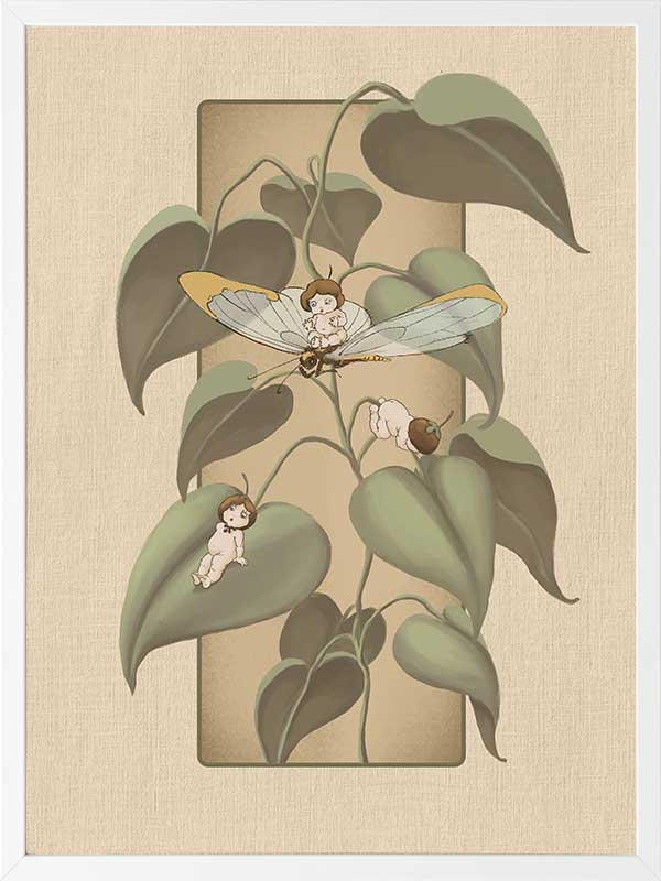 Dragonfly Whispers Beige Framed Art Print - Delicate and full of charm, this wall art from the Urban Road X May Gibbs Artwork Collection brings the playful magic of the Boronia Babies to life. Tucked among the soft, curling leaves, the tiny Boronia Babies enjoy an afternoon of adventure with their dragonfly companion.