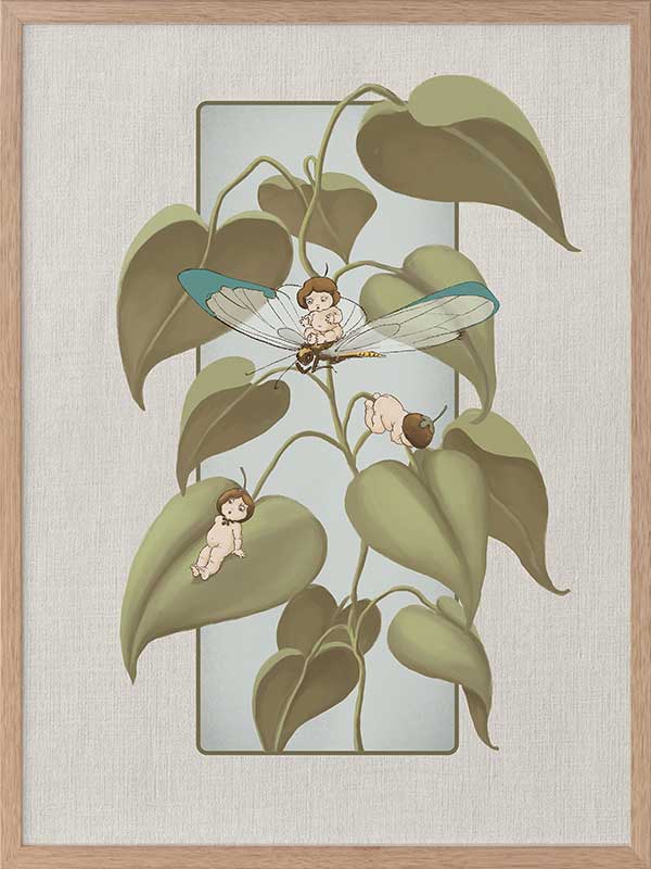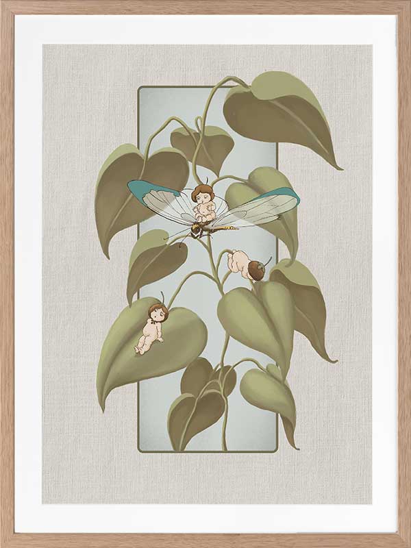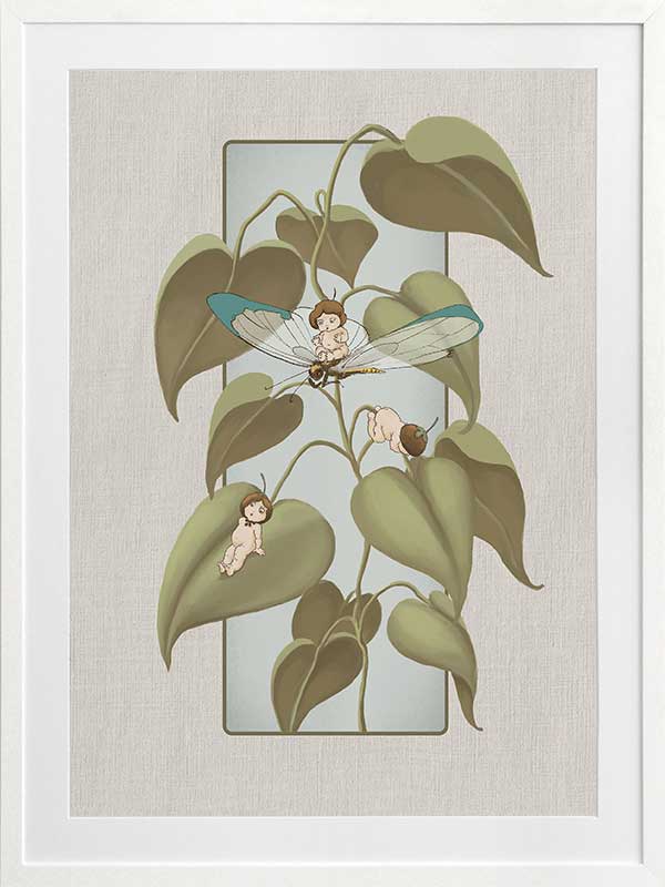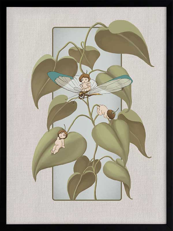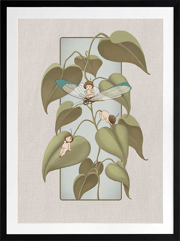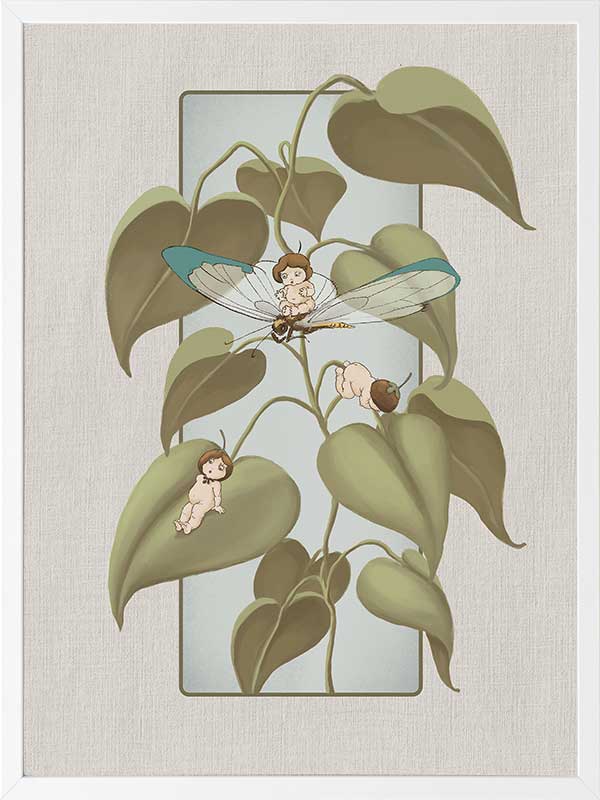 Dragonfly Whispers Grey Framed Art Print - Delicate and full of charm, this wall art from the Urban Road X May Gibbs Artwork Collection brings the playful magic of the Boronia Babies to life. Tucked among the soft, curling leaves, the tiny Boronia Babies enjoy an afternoon of adventure with their dragonfly companion.