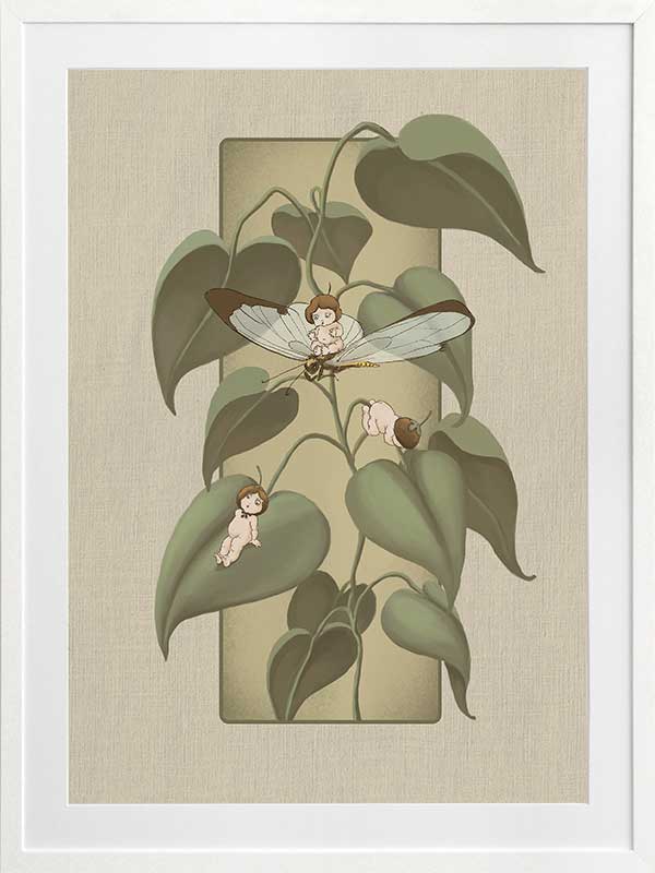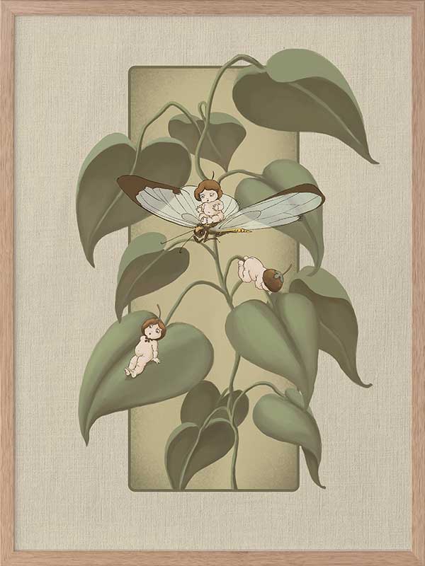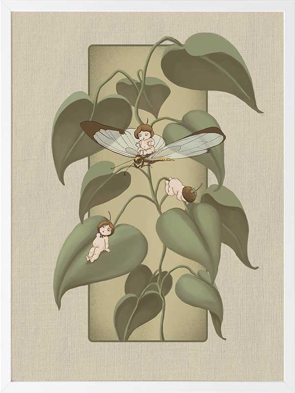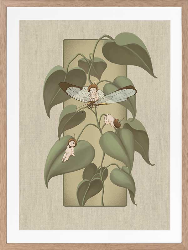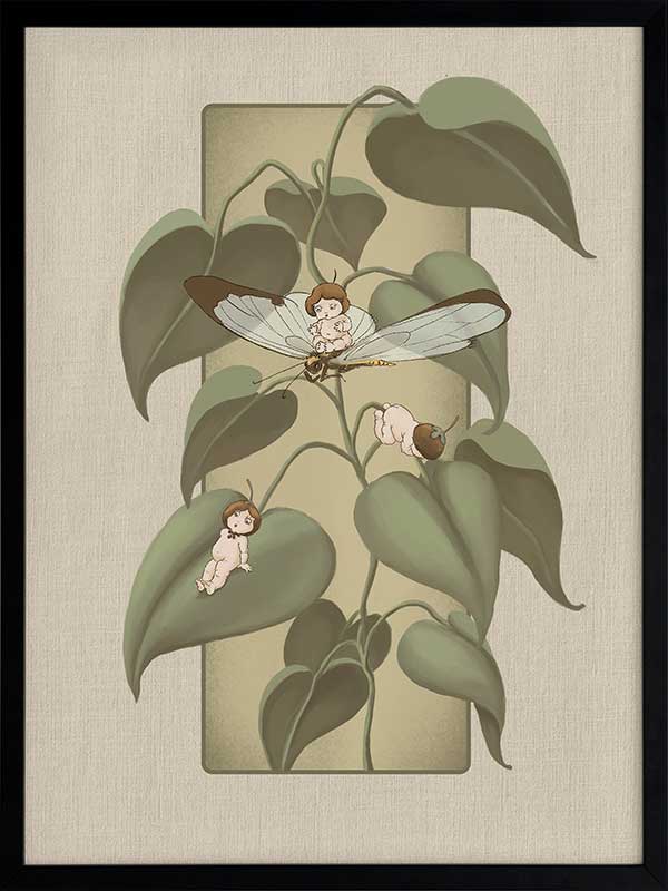 Dragonfly Whispers Olive Green Framed Art Print - Delicate and full of charm, this wall art from the Urban Road X May Gibbs Artwork Collection brings the playful magic of the Boronia Babies to life. Tucked among the soft, curling leaves, the tiny Boronia Babies enjoy an afternoon of adventure with their dragonfly companion.