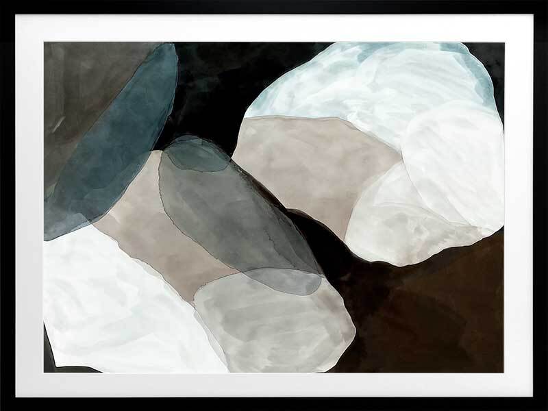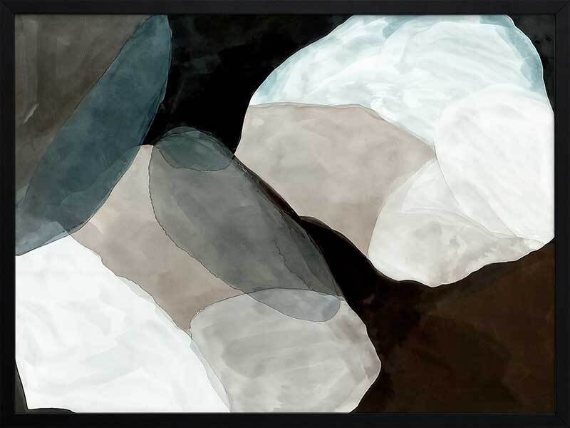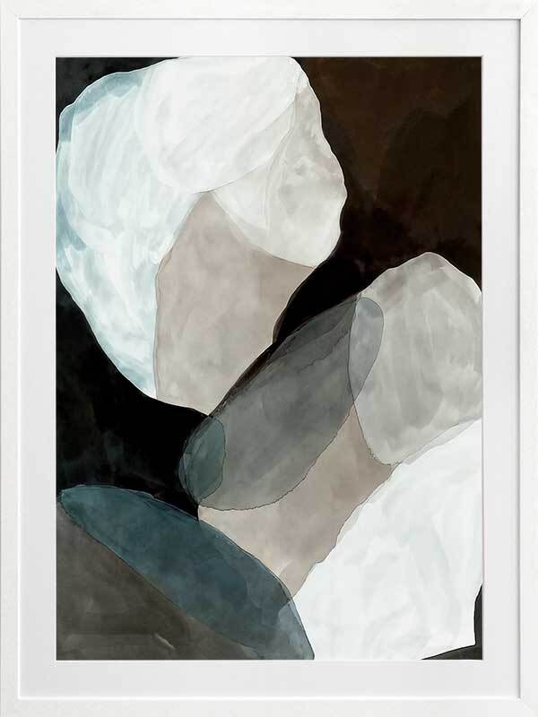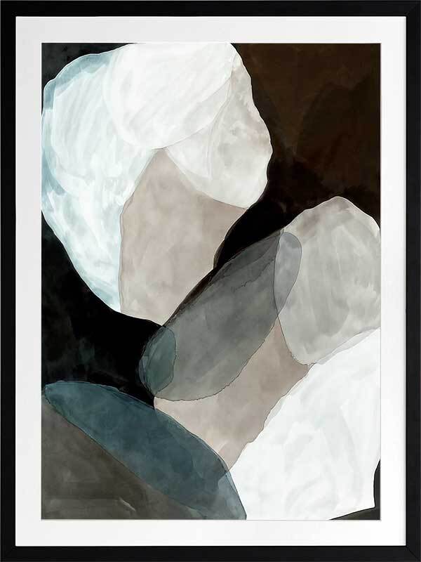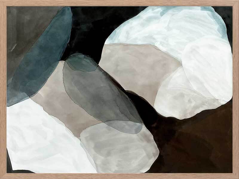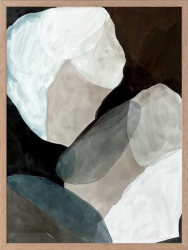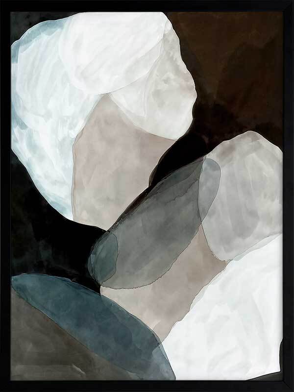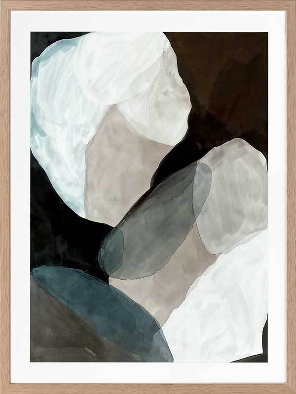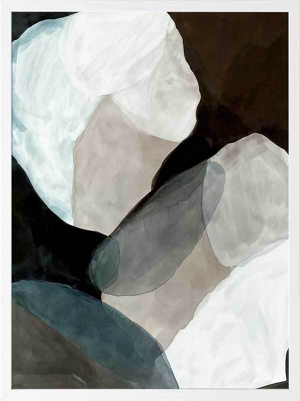 Dream Fragments I Framed Art Print - This abstract artwork, a symphony of watercolour brush strokes, brings a touch of mid-century modern elegance to any space. With its harmonious blend of brown, blue, and neutral hues, and fluid, organic shapes, this wall art evokes a fresh, calming vibe - perfect for enhancing any living room or bedroom.