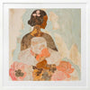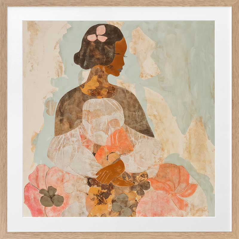 Dreaming of Marigolds Framed Art Print - Like a dream bursting with marigold flowers, this soft, feminine art print makes a calm, yet bold impact with transparent layers that fall atop each other like a collage. Neutral shades of brown and beige balance soft hues of pink, orange and blue, making this floral artwork easy to incorporate into any interior style, especially bohemian spaces.