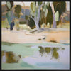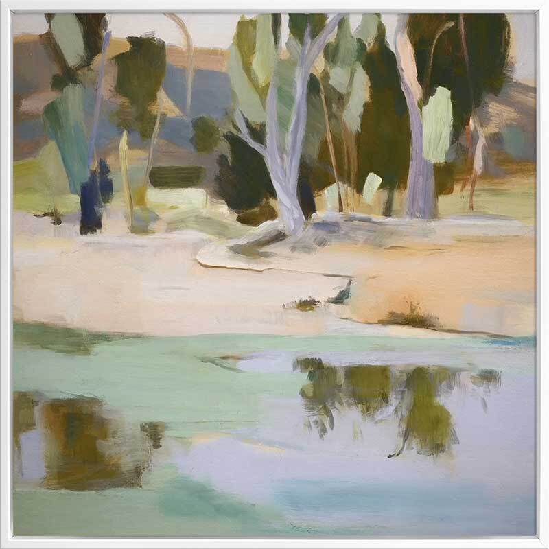 Dreamy Pond Canvas Art Print - Gentle hues of green, beige, and blue come together in this serene abstract landscape art. The reflection of trees in calm waters evokes a sense of tranquillity and natural beauty. Perfect as coastal art for bedroom or living room walls, this modern artwork adds a soothing, elegant touch to any interior.
