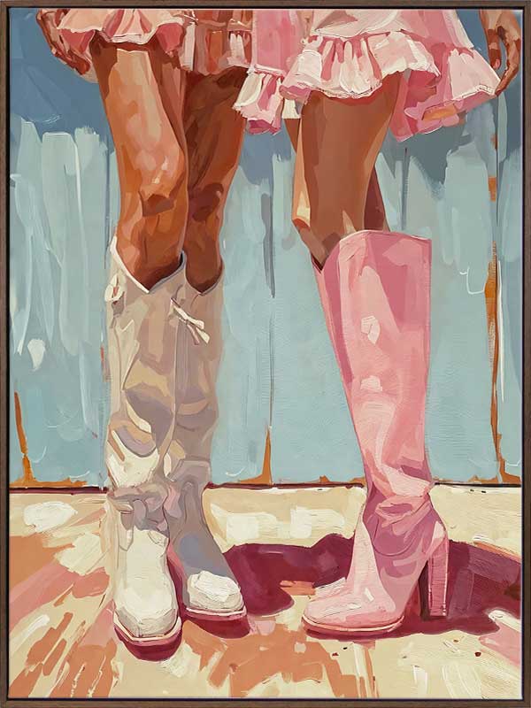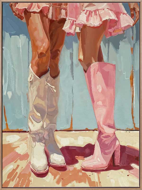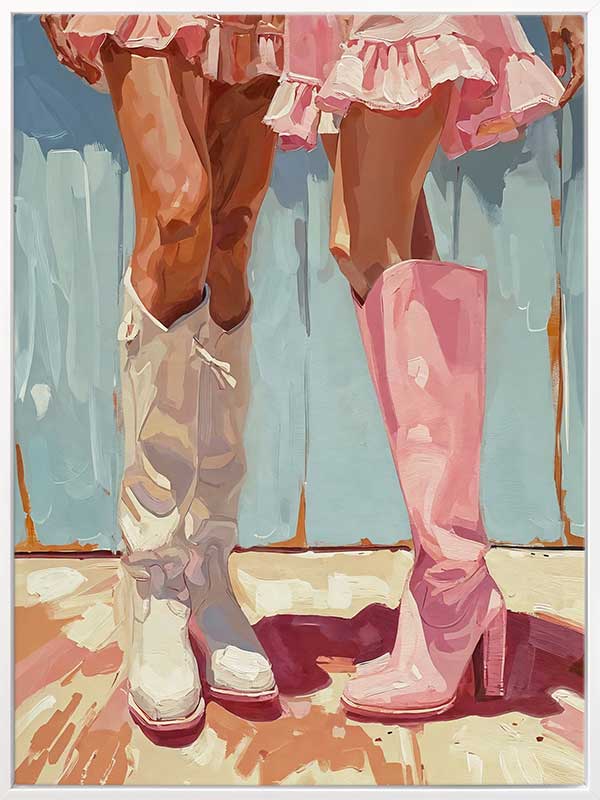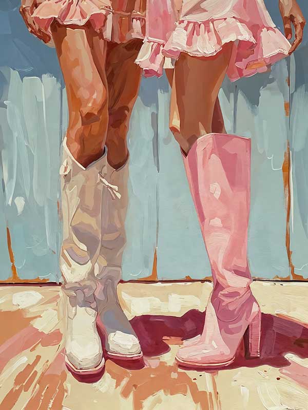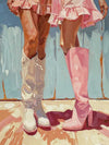 Dressed for Tour Poster - These Swifties are besties, donned in white cowboy boots and heeled, pink cowboy boots, wearing pink flowy dresses, and they're ready for the Eras Tour and every Taylor Swift concert that follows. This poster brings sweet, joyful vibes to life with warm pink tones and creamsicle orange shades, balanced out by pale blue hues to add a pop to any space.