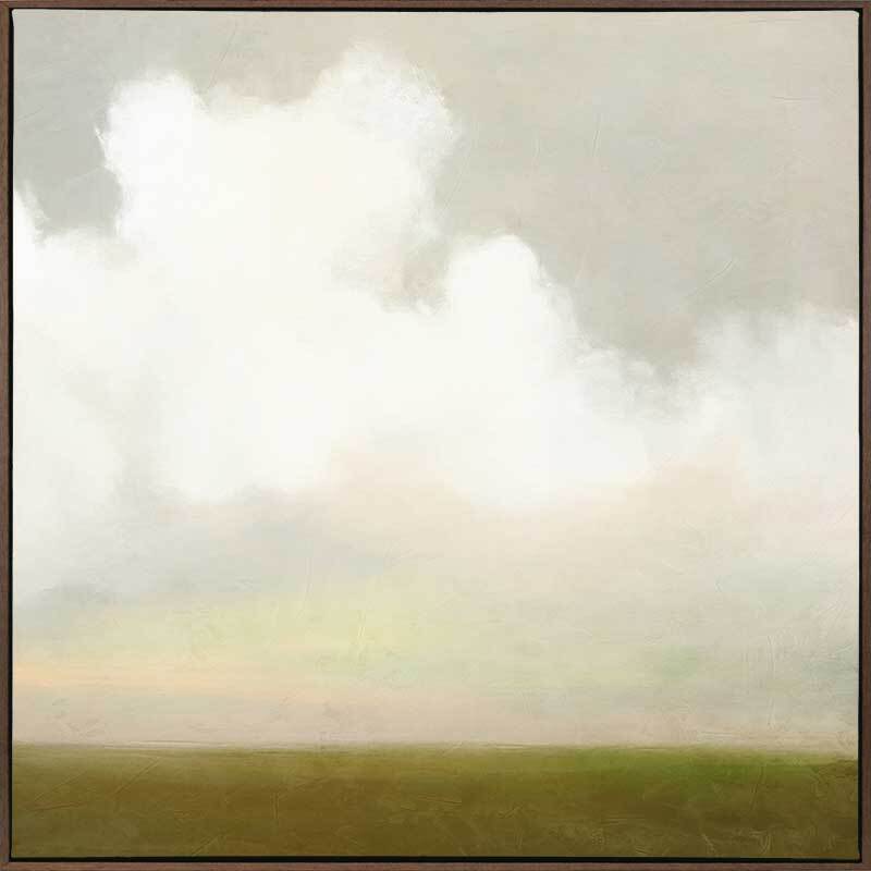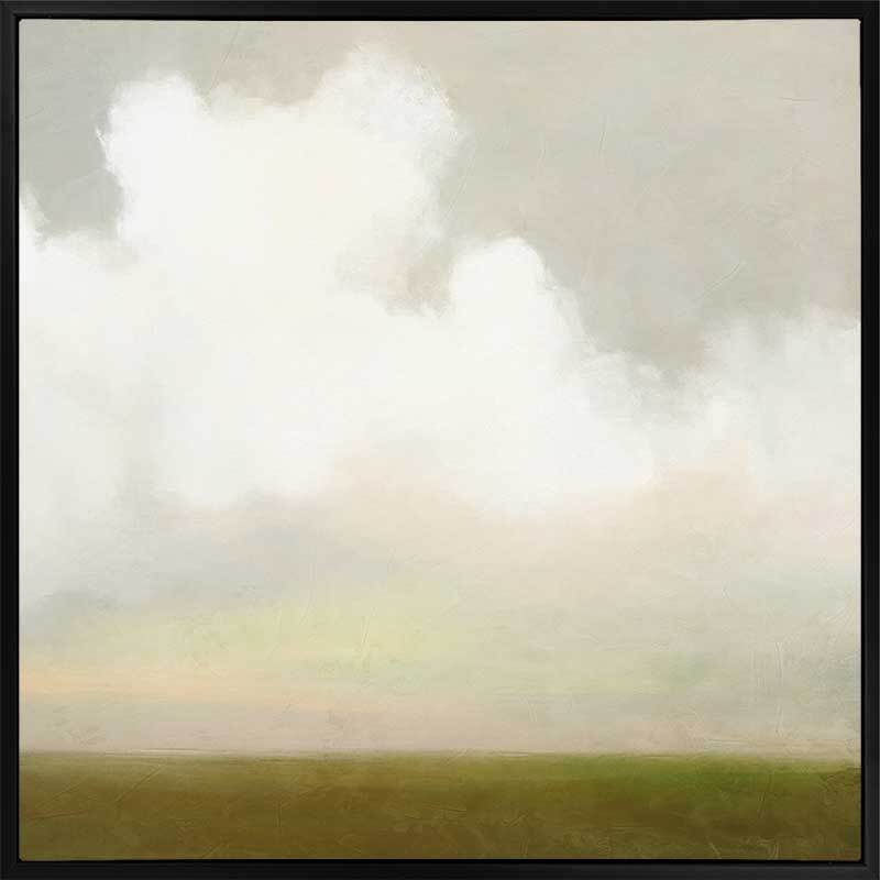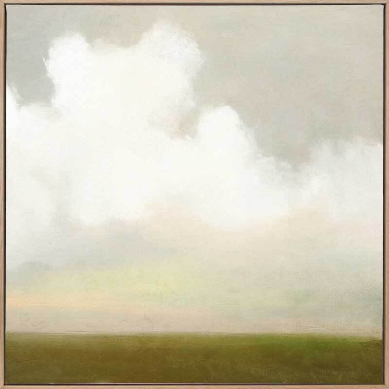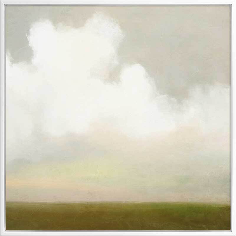Drifting Canvas Art Print - These soft, cottony clouds bring the dreamiest sense of calm to your space, with a grassy field below that evokes an earthy touch. Featuring a palette of soft green and hazy white and grey shades, and pillowy brush strokes for a gentle feel, this landscape wall art is ideal for any interior style.