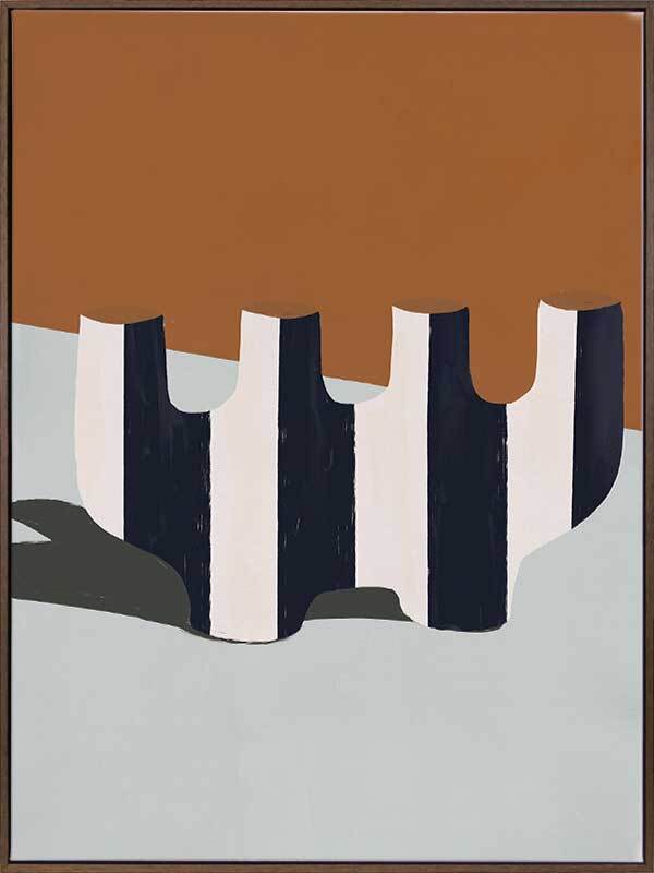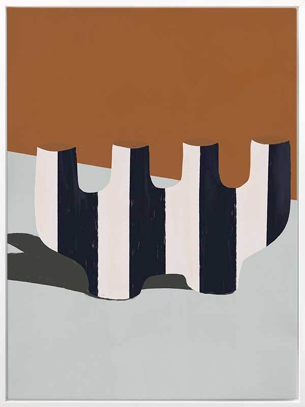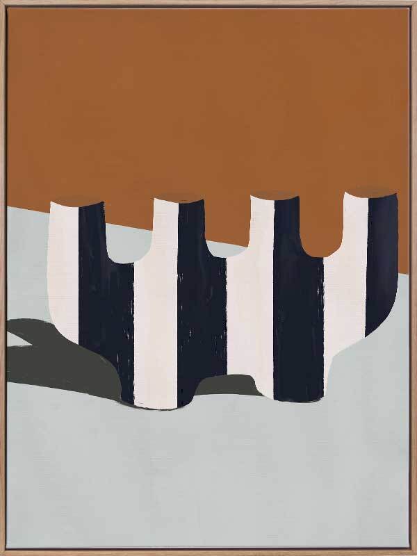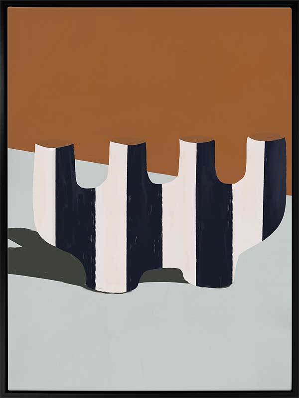 Dunes Canvas Art Print - This unique twist on a still life of our gorgeous Esme Ceramic Vessel uses flat colours and a limited colour palette for a striking, yet simplified statement. A warm orange-toned brown contrasts against a deep azure blue, with light and dark grey tones to neutralise the intensity. Like the myriad of textures you'll find among handmade pieces along the market streets of Marrakech, this artwork features a texturized look to enhance that rustic feel.