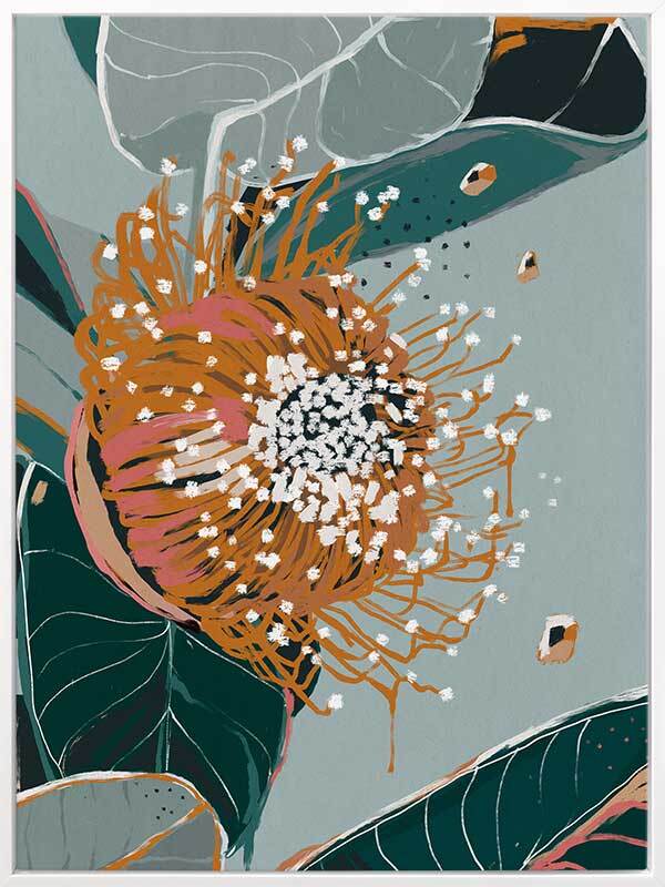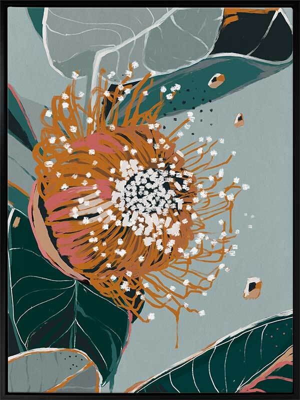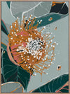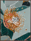 Dusty Flowering Gum II Canvas Art Print - Calm and relaxed, this gentle, Australiana-themed artwork features a close-up of a textured, painterly style flowering gum. The colour palette features a muted sage green background contrasted by the warm, beige and mustard tones of the flowering gum. Pairs with Dusty Flowering Gum I.