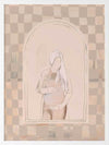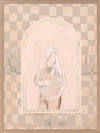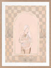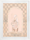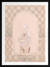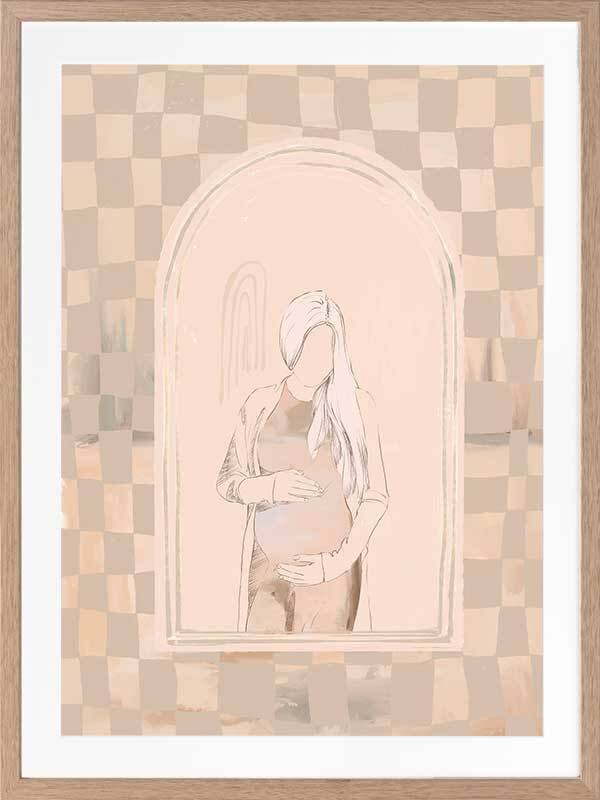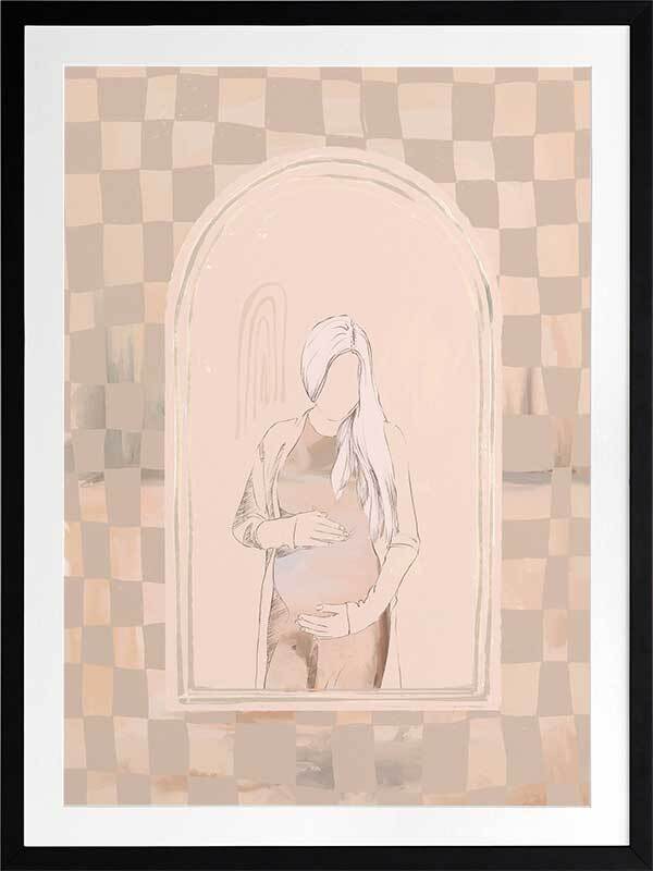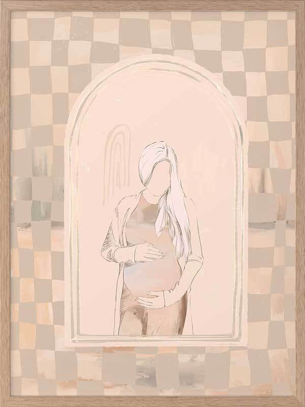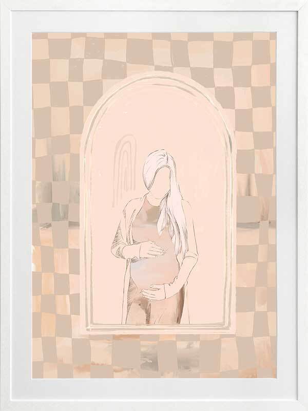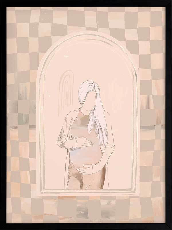 Eager Framed Art Print - Eager to meet you, little one. This piece has a soft, ethereal energy to it with a soft outline of a pregnant woman, using muted beige tones for a neutral look. A wonky checkerboard pattern in the background brings a laidback, comforting feel, with silhouette imagery in the centre to capture a perfect moment in time.