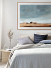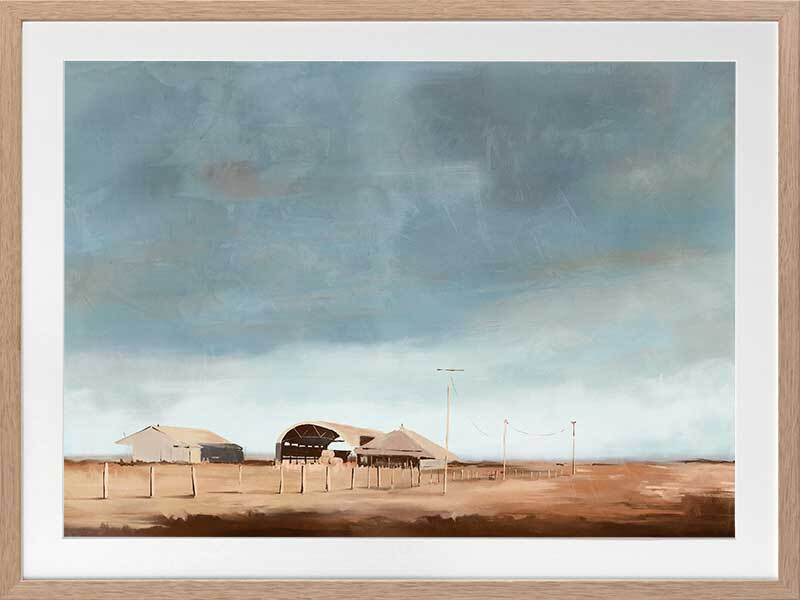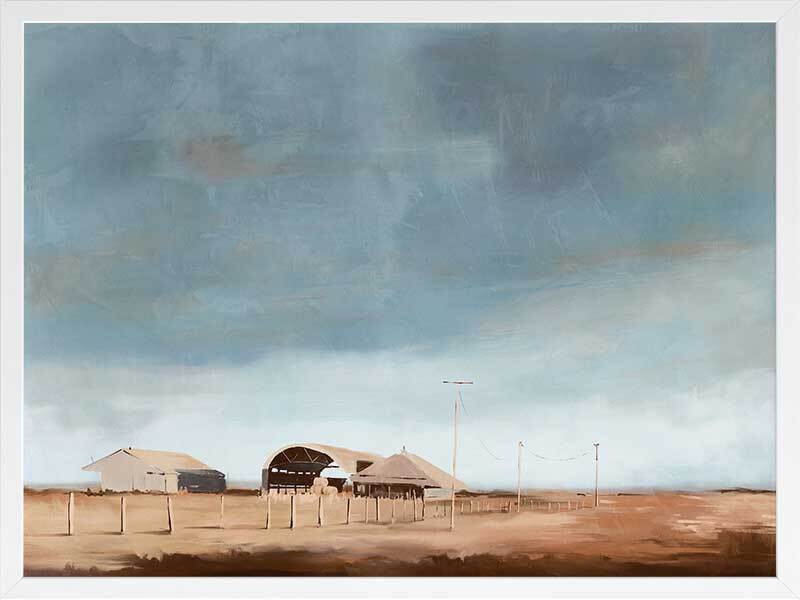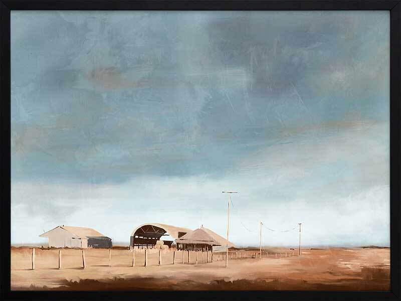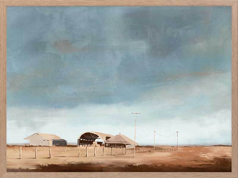 Earthen Heart Framed Art Print - A standout piece in this contemporary art collection by Darren Palmer. "Earthen Heart" reflects the deep emotional connection to the land, weaving a narrative of continuity, nostalgia, and the unbreakable bond of home. Inspired by a photograph taken by Darren's father, this artwork symbolises a passage from coastal central Queensland to the elevated Atherton Tablelands rainforest, evoking memories of cherished family road trips through scenic vistas. Featuring wispy rain clouds, soft brushstrokes, and a simple palette of greyish blue and warm sand tones, this piece merges perfectly with any interior.