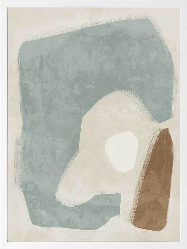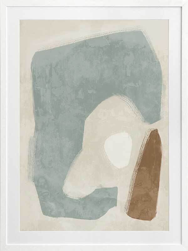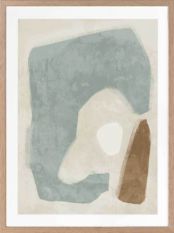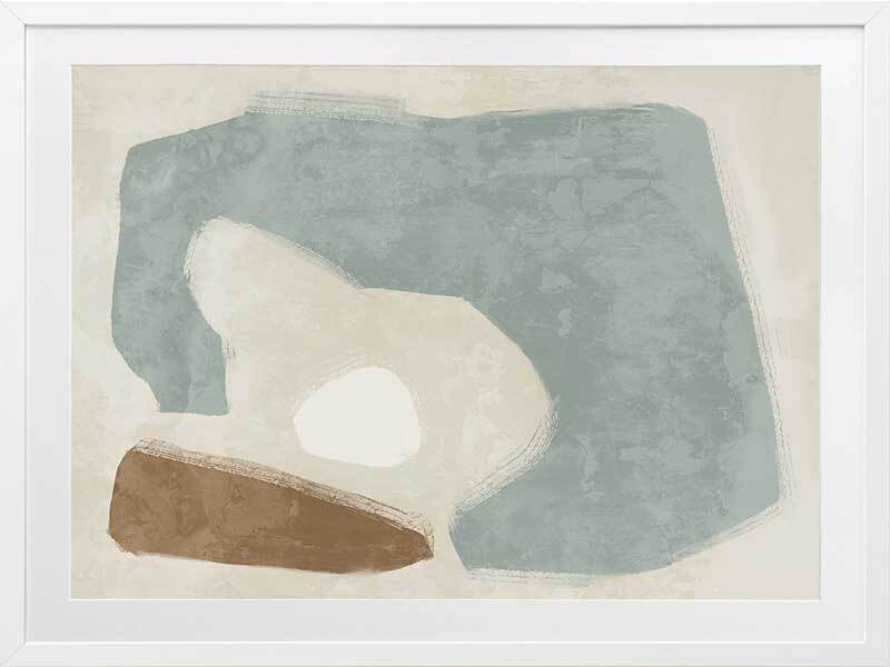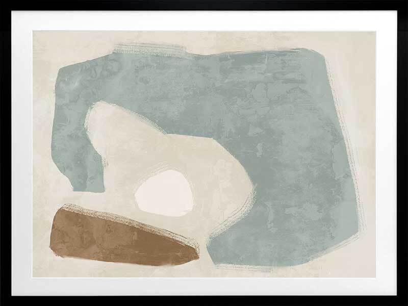 Easy Does It Light Teal Framed Art Print - This abstract artwork makes a unique, yet subtle statement in your space with interesting shapes and a minimalistic colour palette of light teal, brown, and sand.