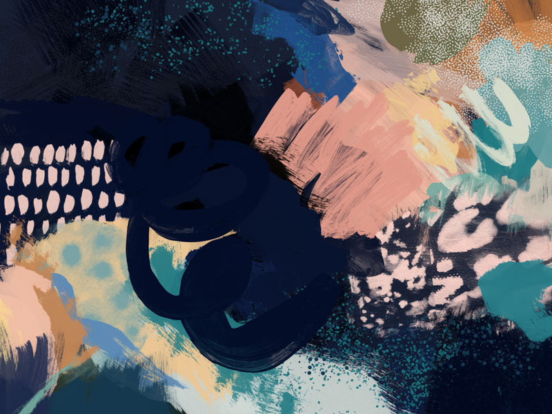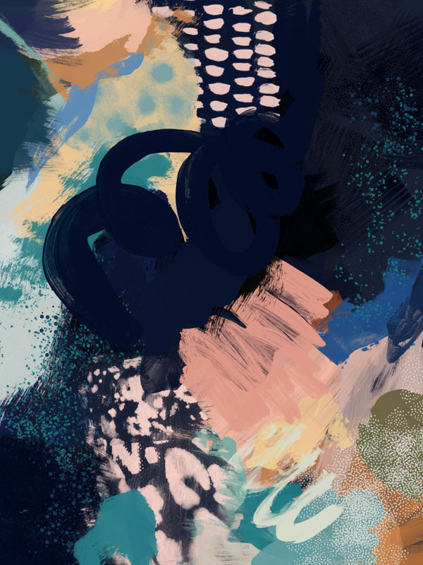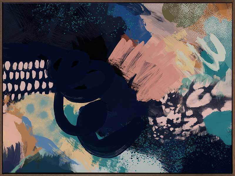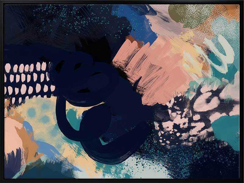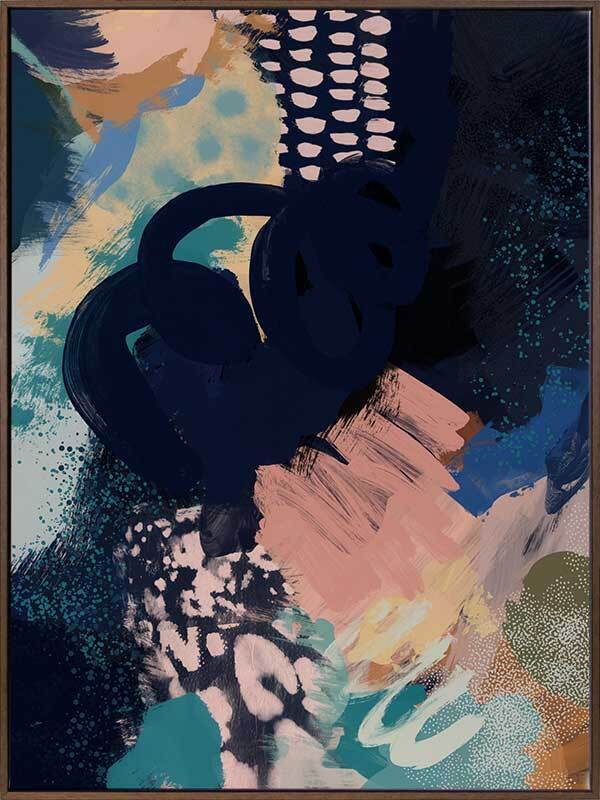 Elbe Canvas Art Print: A striking abstract artwork that features overlaid brushstrokes, splatters and patterns in a bold blue, pink and teal colour palette. 2020 AUTUMN/WINTER COLLECTION: REVERIE