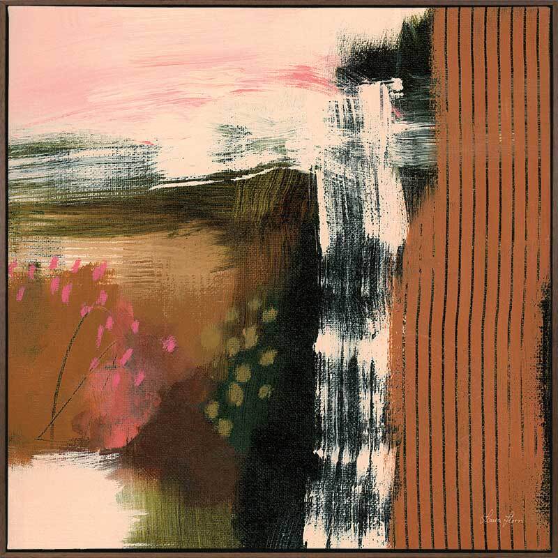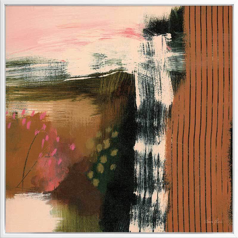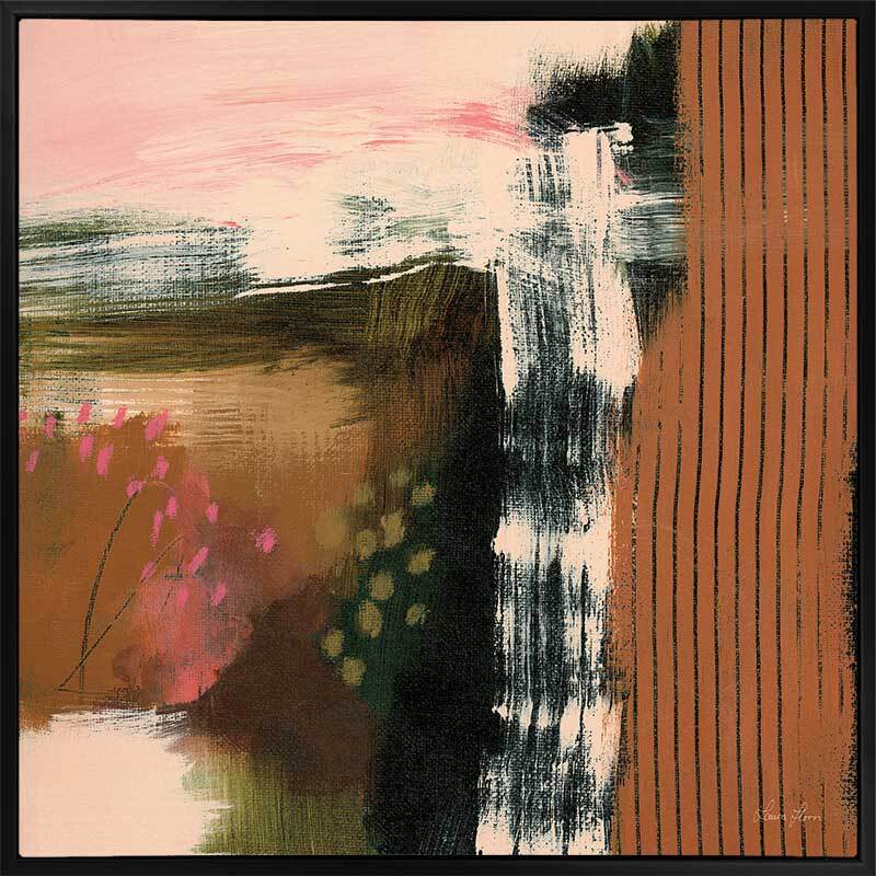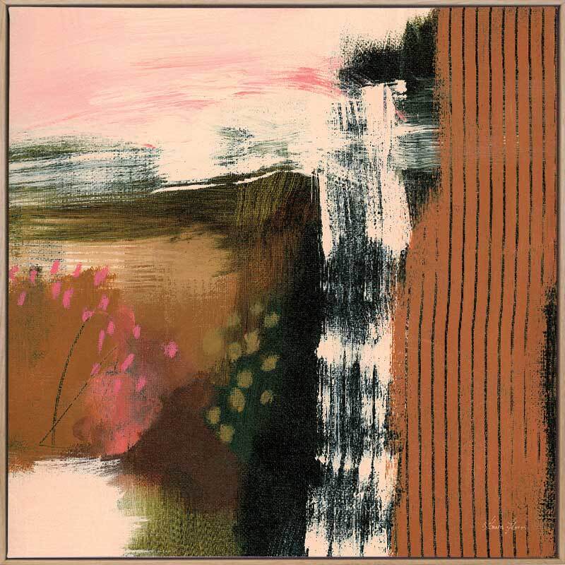 Embankment Canvas Art Print - With quite an organic palette of warm brown, forest greens, and light and rosy pink, this abstract piece uses contrasting lines and dots with dry brush strokes for a bold, yet subdued look and feel. By Artist Laura Horn.