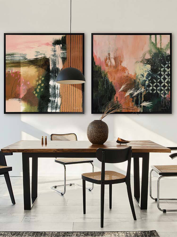 Our Wild Side Collection features a series of dynamic abstract artworks with unique pattern combinations and organic, free-flowing shapes. There's something for everyone in this collection, with an underlying neutral theme in most pieces using beige tones, warm browns and oranges, and blush pinks. Plenty of pops of colour can be found throughout, with soft blues, yellows, greens, and even some beautiful shades of lilac purple. With paint drips, visible brush strokes, and splashes of watery colour, these statement pieces bring a refreshing energy you can share when surrounded by loved ones in the kitchen, living room, and everywhere in between.