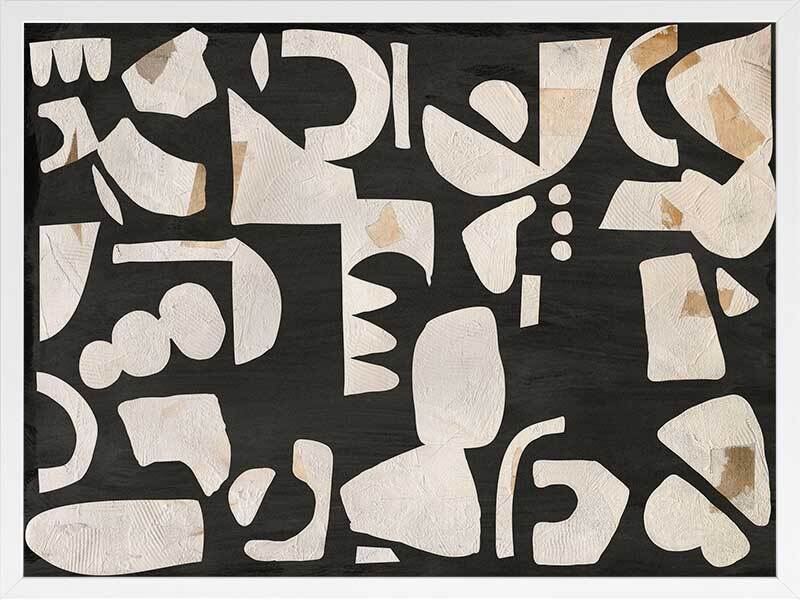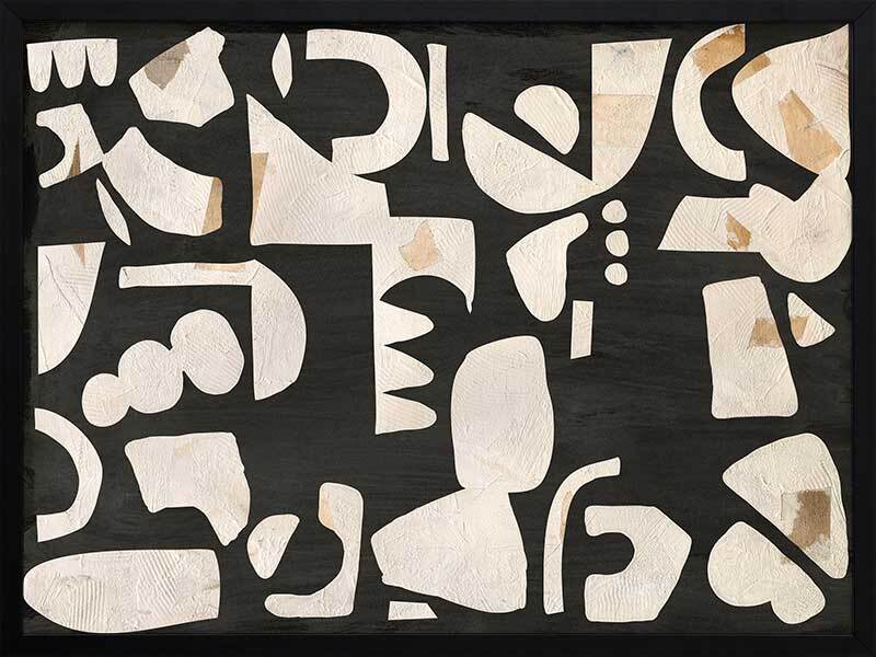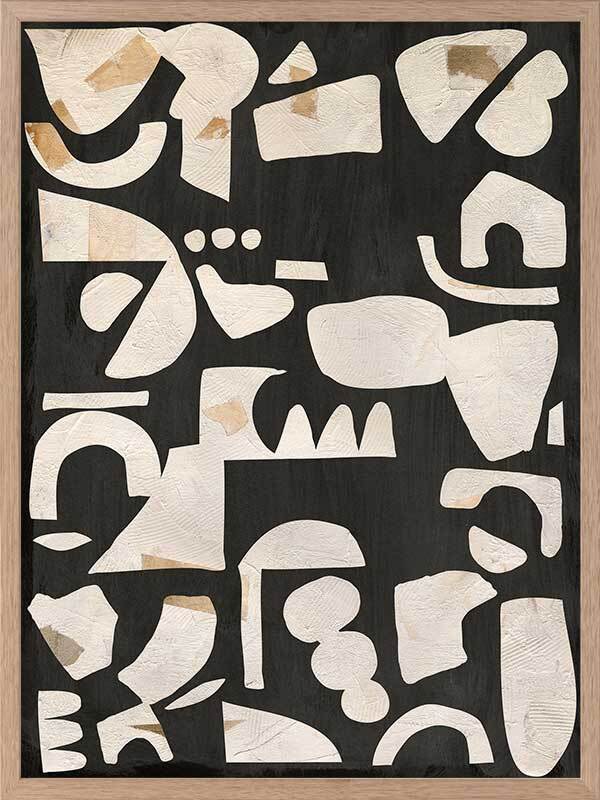 Embracing Asymmetry Black I Framed Art Print - Dynamic yet minimal, this abstract artwork will breathe life into your space with a fun array of soft shapes and a neutral palette of light beige and black with a wood-grain finish. Style this piece with Embracing Asymmetry Black II to create your own gallery wall.