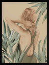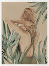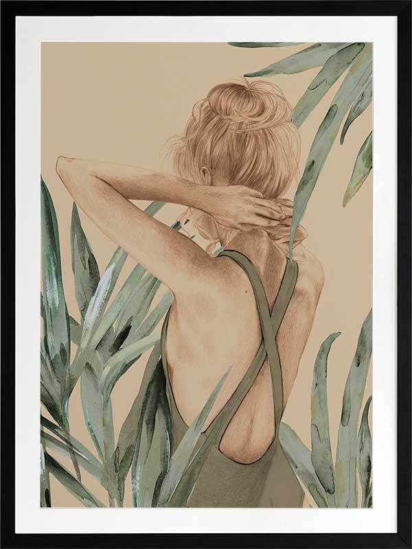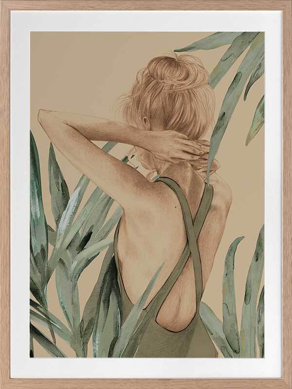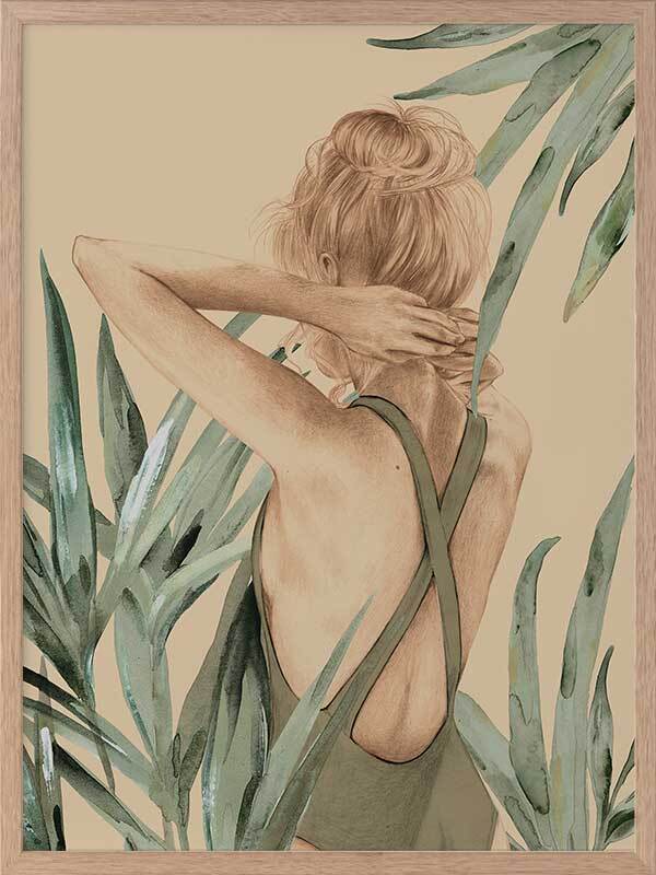 Empowered Framed Art Print - Patricia Mendes x Urban Road - A beautifully soft and feminine illustration featuring the back of a woman in a swimsuit surrounded by lush foliage. The colour palette is muted and warm, with soft clay, brown, khaki green, and sage tones.