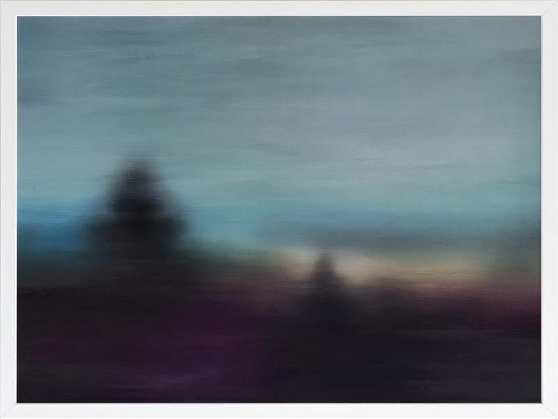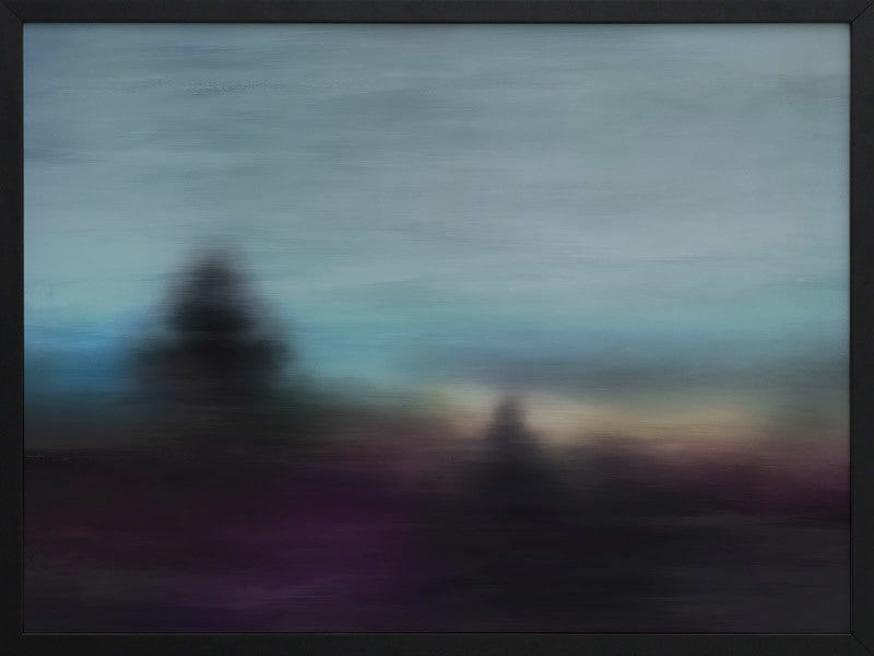 Enchanted Forest Framed Print: A blurred landscape artwork featuring a dark forest treeline flecked with deep purple against a grey-blue sky. 2019 AUTUMN/WINTER COLLECTION: ODYSSEY