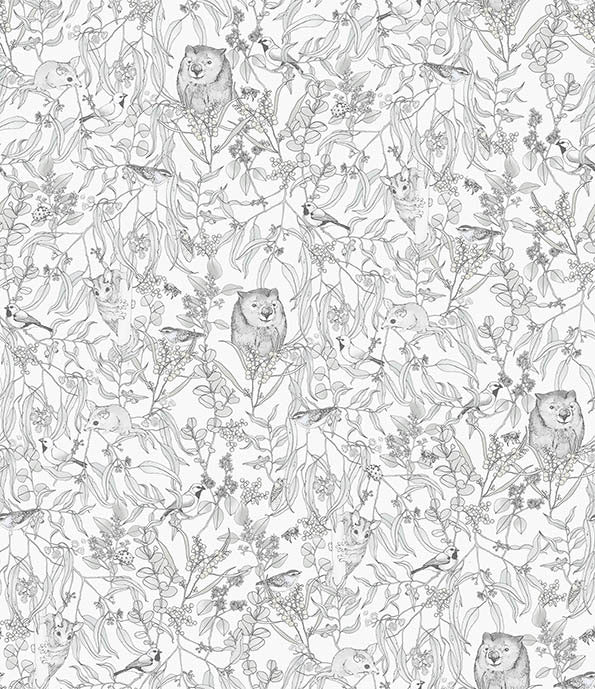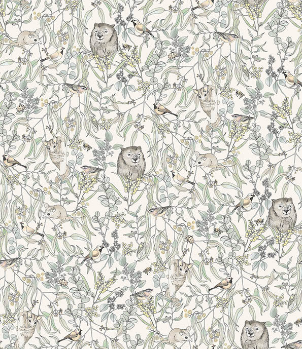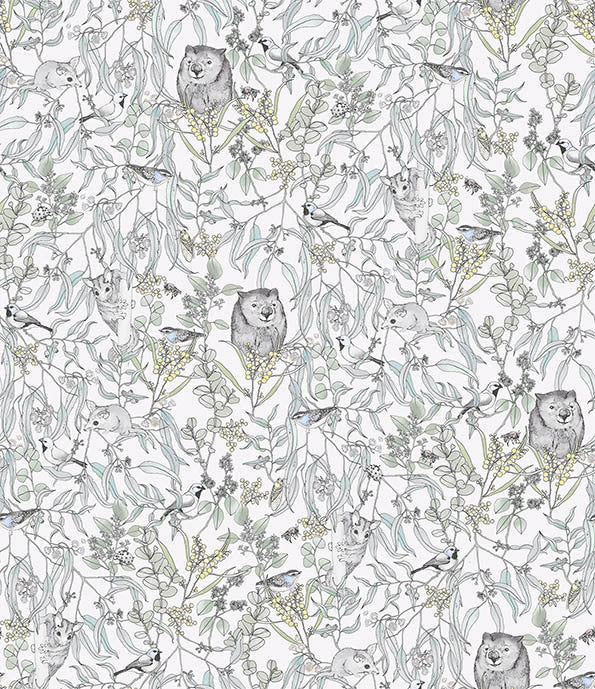 Endangered Wombat Wallpaper - Adorable and playful, this gorgeous wallpaper design depicts the Endangered Wombat, gently smiling with its fluffy ears and button nose peering through the brush, surrounded by its other furry native Australian friends. This is the perfect pattern for kid's playrooms or bedrooms, or even as a statement wall in any space. Choose from multicolour, muted green, soft pink, periwinkle and greyscale.
