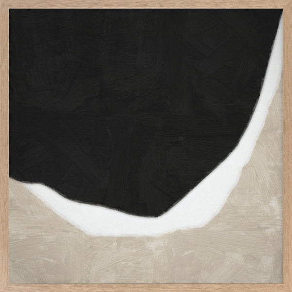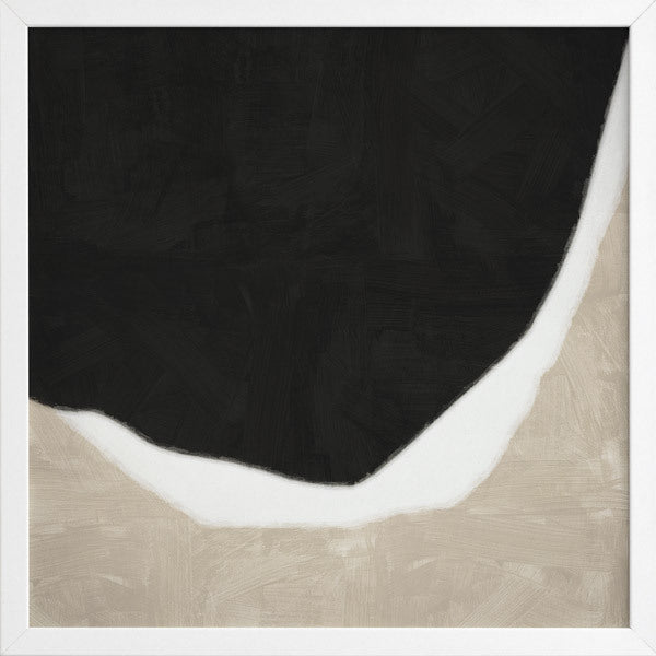 Eon II Framed Print: A balanced abstract artwork featuring a black and white shape against a textured nude background. Pairs with Eon I. 2019 SPRING/SUMMER COLLECTION: SOLSTICE