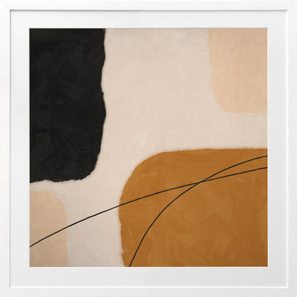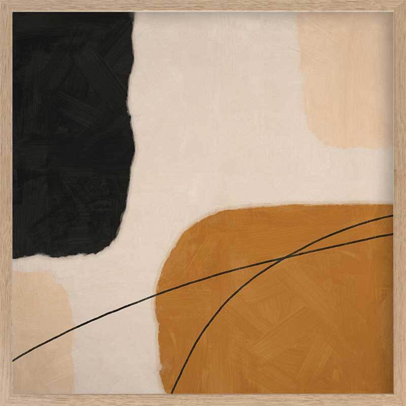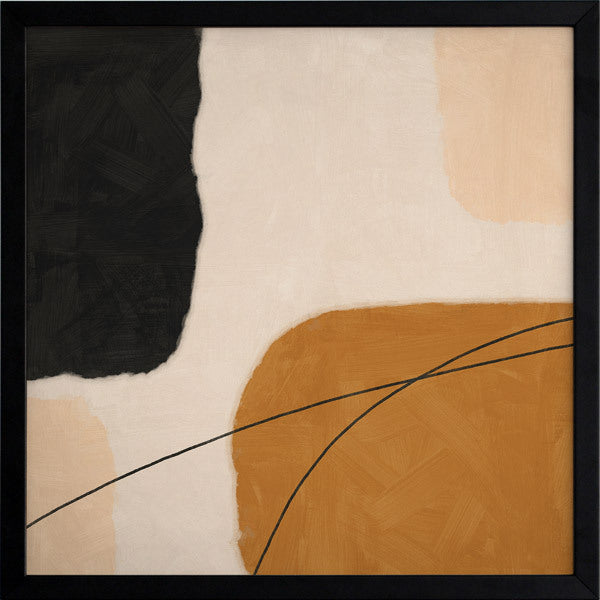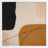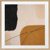 Epoch I Framed Print: A balanced abstract artwork featuring shapes in warm tones of brown, peach and black against a soft nude background. Pairs with Epoch II. 2019 SPRING/SUMMER COLLECTION: SOLSTICE