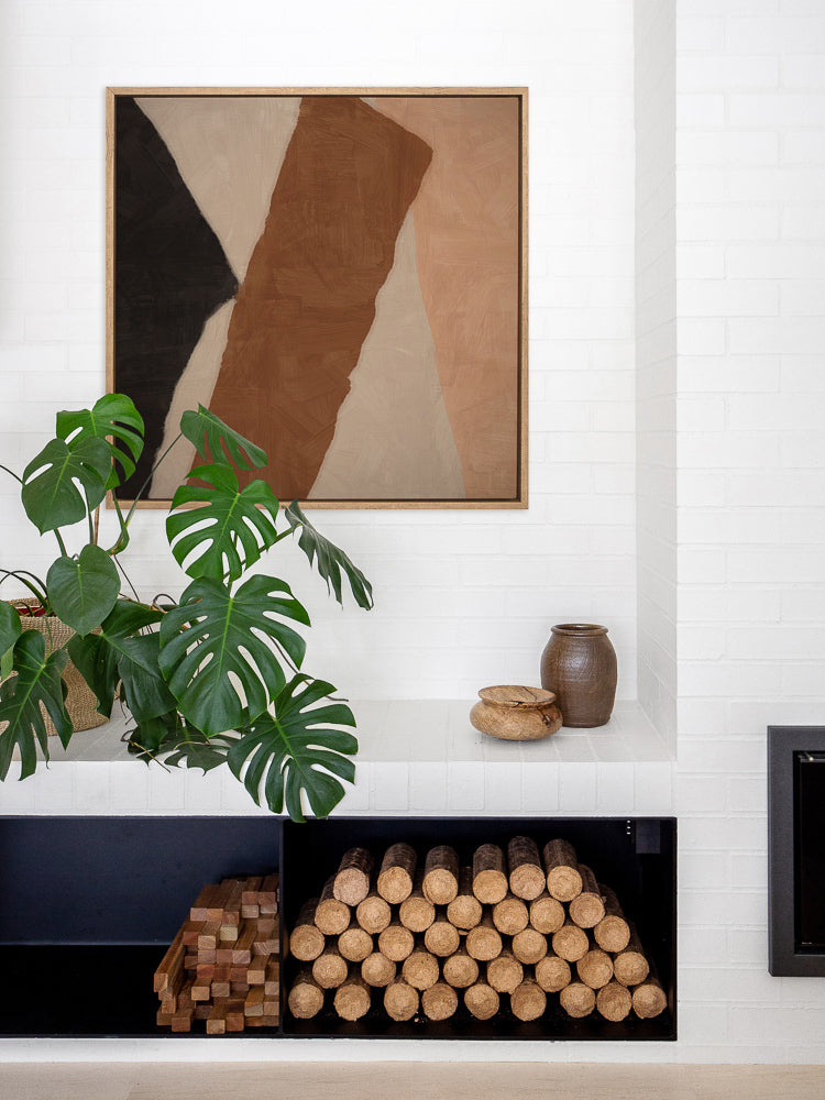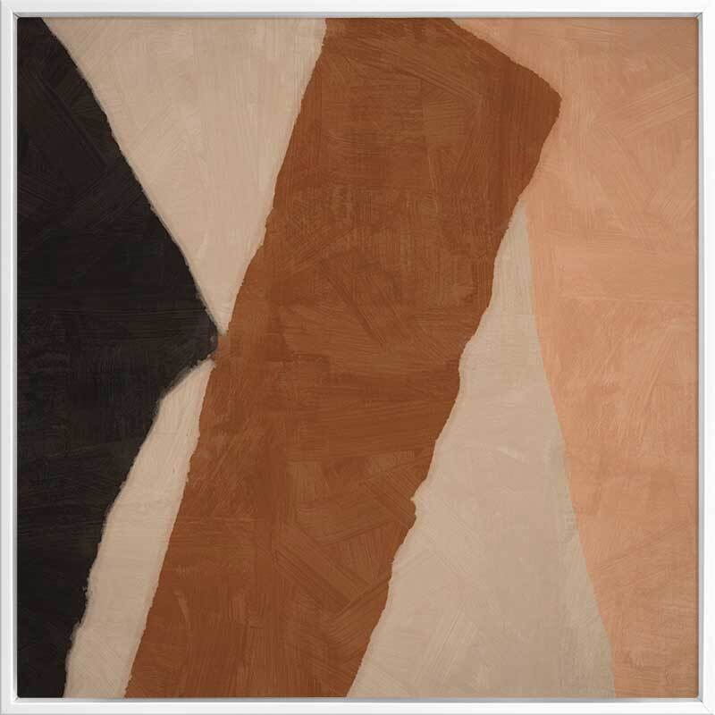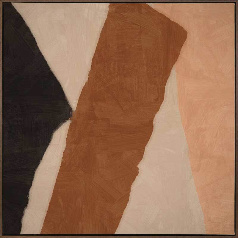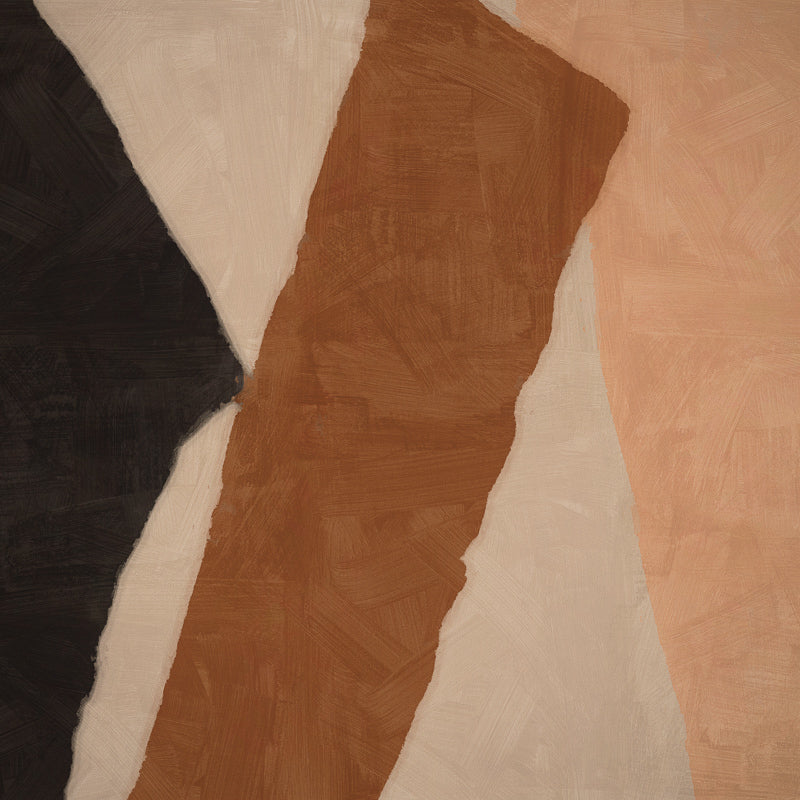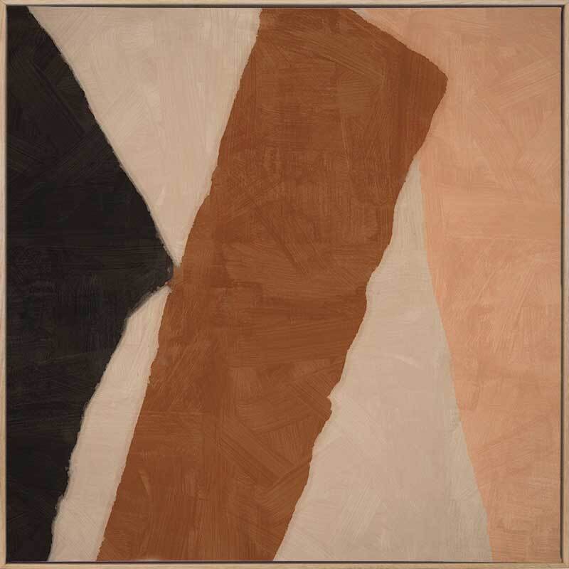 Epoch II Canvas Art Print: A balanced abstract artwork featuring shapes in warm tones of brown, peach and black against a dark nude background. Pairs with Epoch I. 2019 SPRING/SUMMER COLLECTION: SOLSTICE