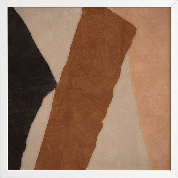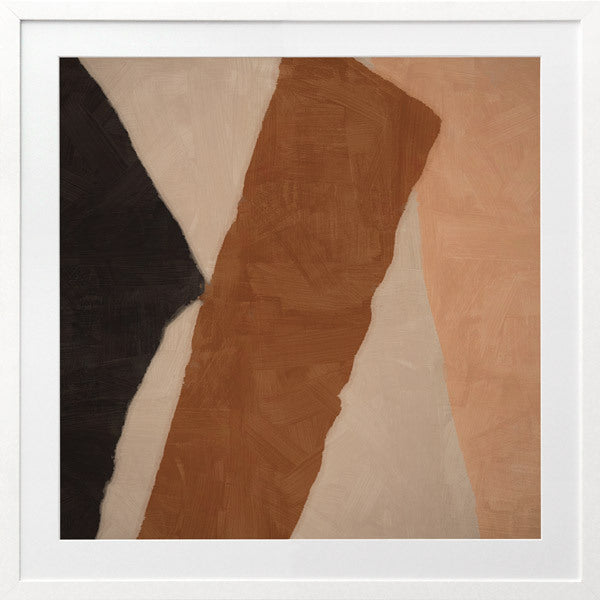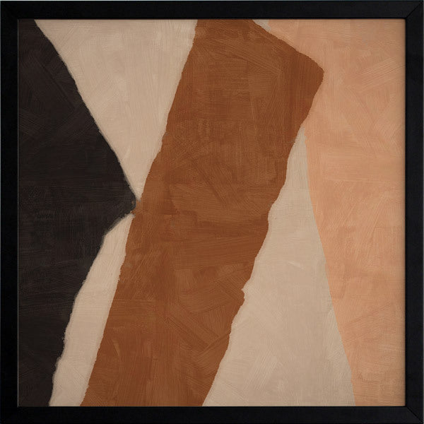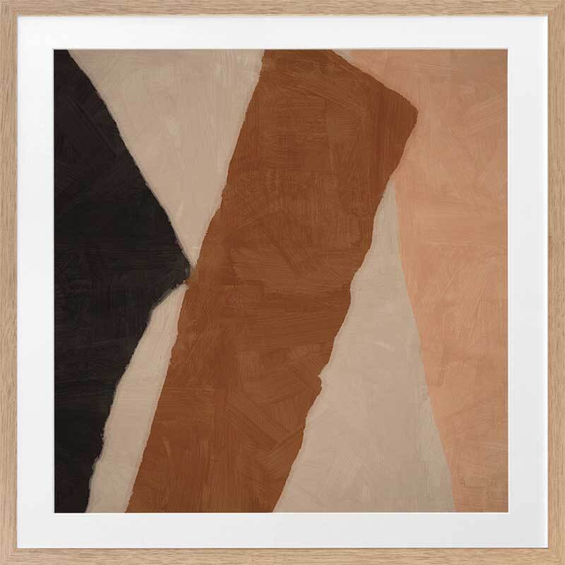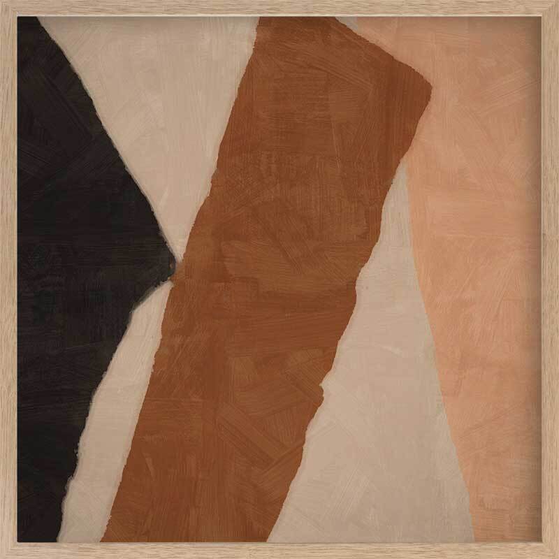 Epoch II Framed Print: A balanced abstract artwork featuring shapes in warm tones of brown, peach and black against a dark nude background. Pairs with Epoch I. 2019 SPRING/SUMMER COLLECTION: SOLSTICE