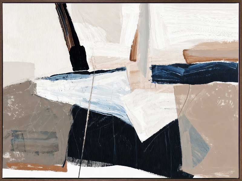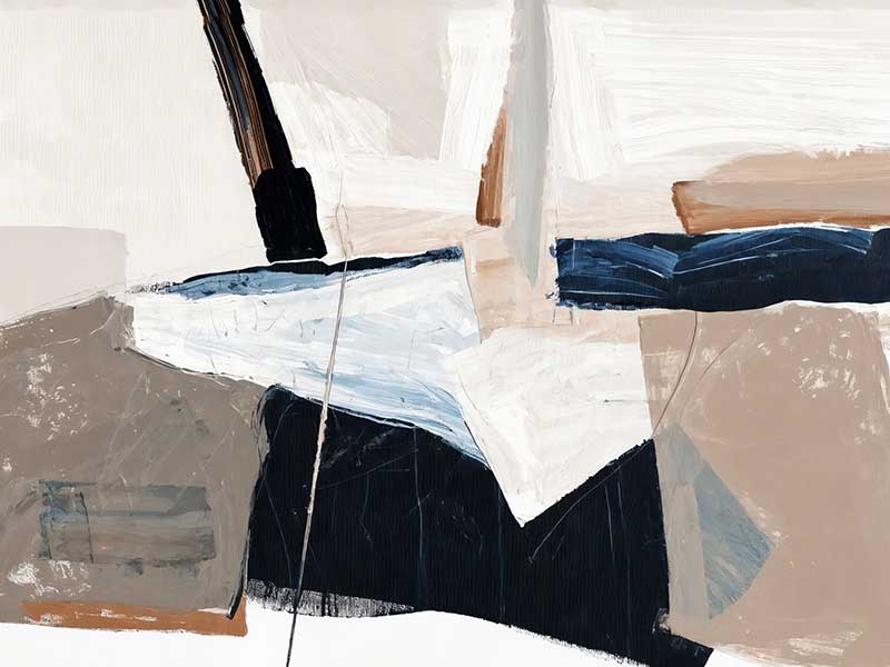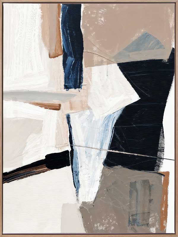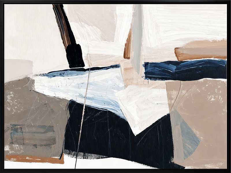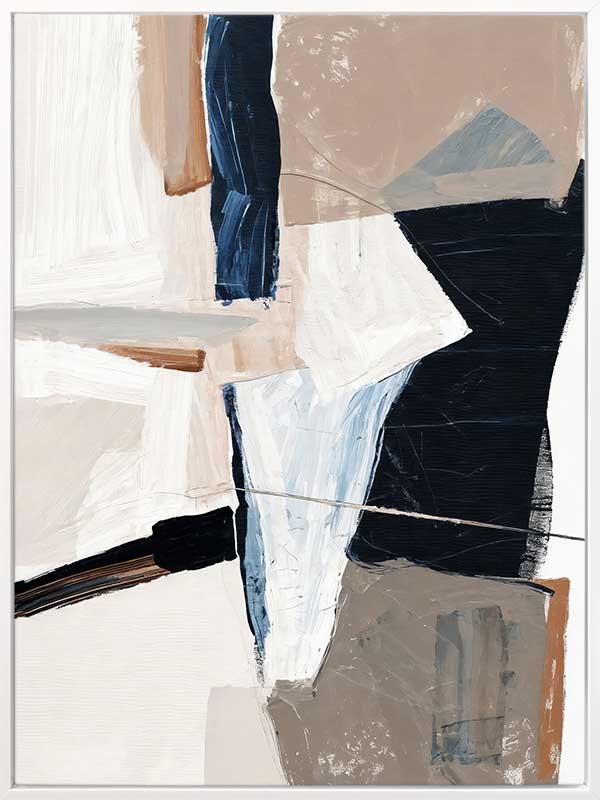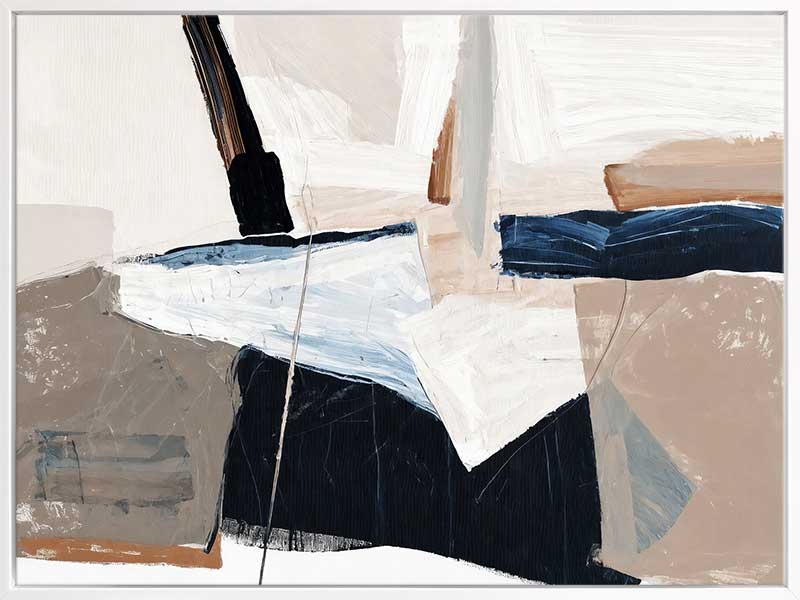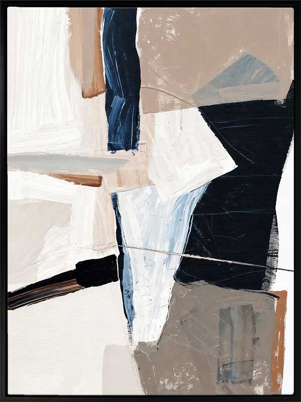 Equilibrium III Canvas Art Print - Chaotic yet calm, this abstract wall art print brings an energy to any space. With visible brush strokes, colliding blocks of colour, and paint splatter and drips, this piece is the perfect addition to any space that needs an upgrade. With neutral tones of beige, dark and light blue, and white, this artwork is versatile for any space.