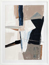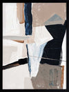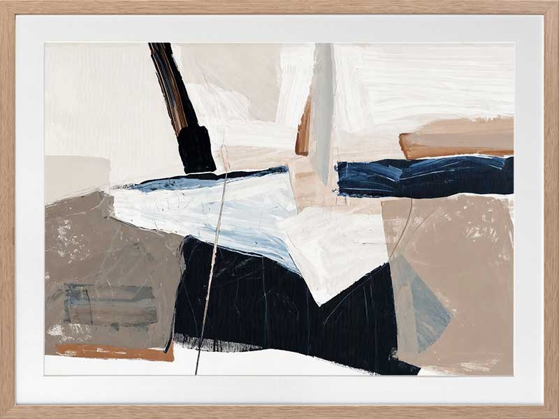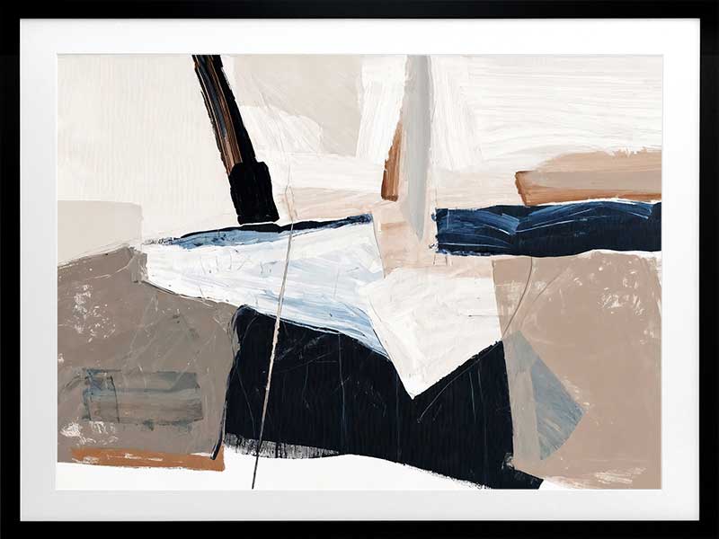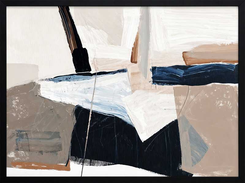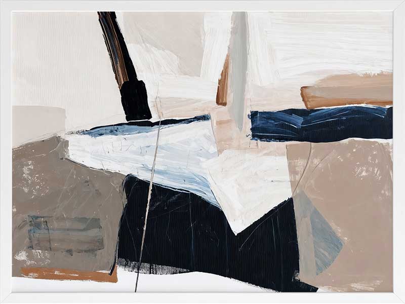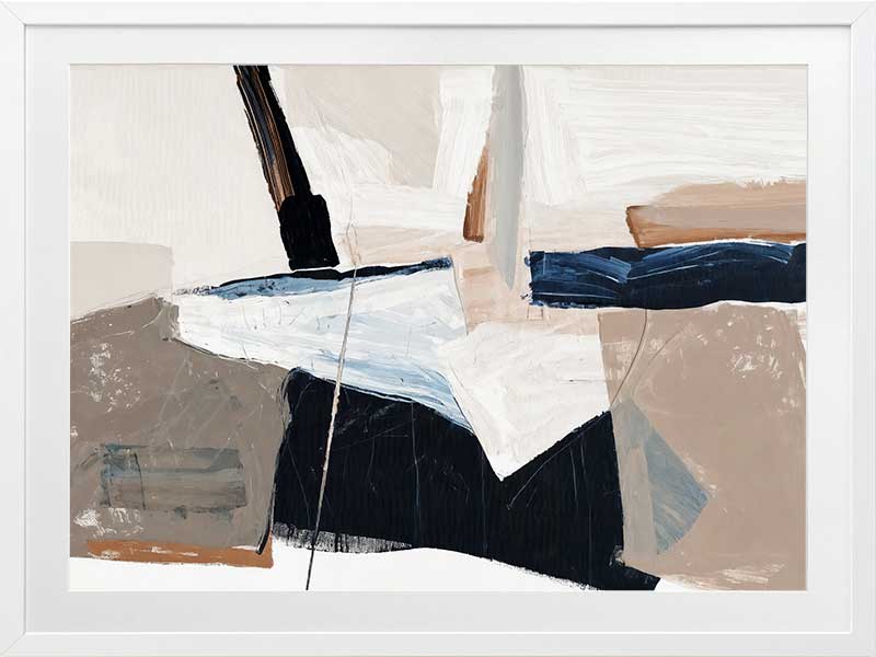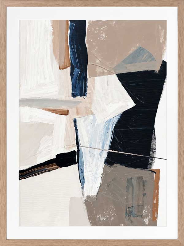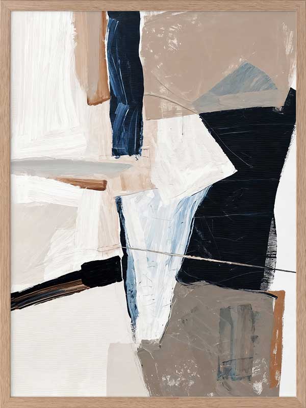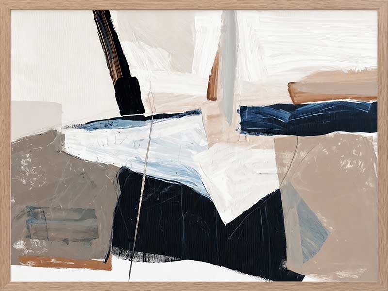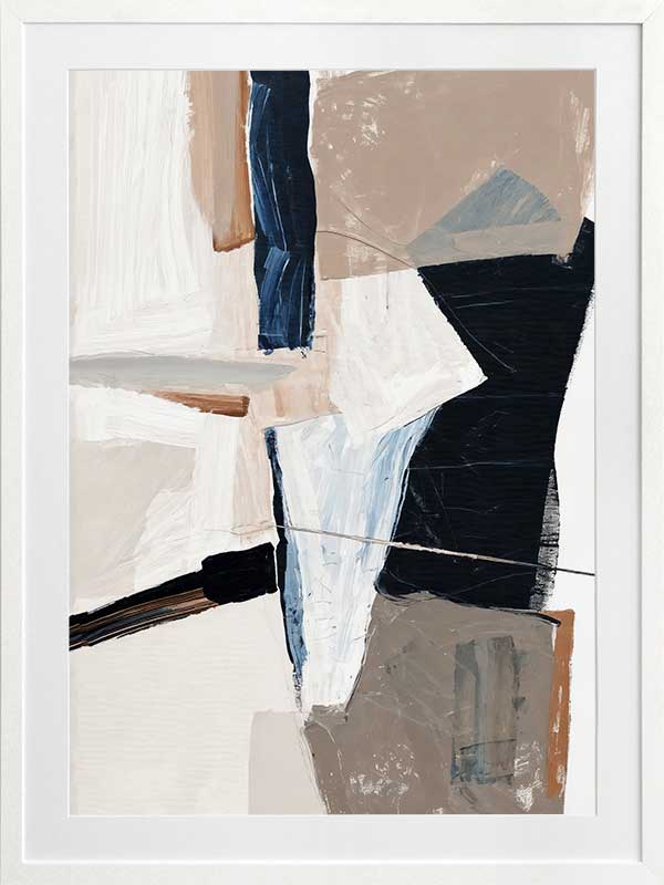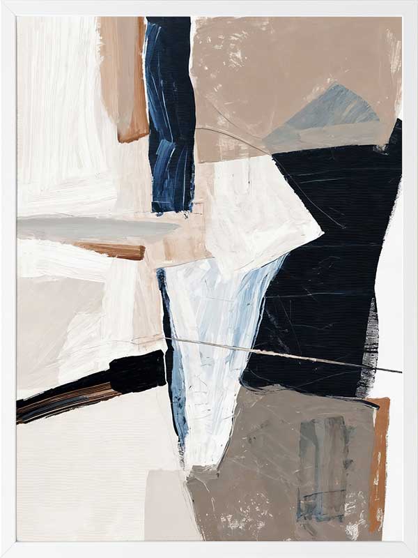 Equilibrium III Framed Art Print - Chaotic yet calm, this abstract wall art print brings an energy to any space. With visible brush strokes, colliding blocks of colour, and paint splatter and drips, this piece is the perfect addition to any space that needs an upgrade. With neutral tones of beige, dark and light blue, and white, this artwork is versatile for any space.