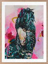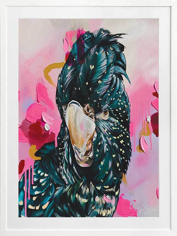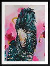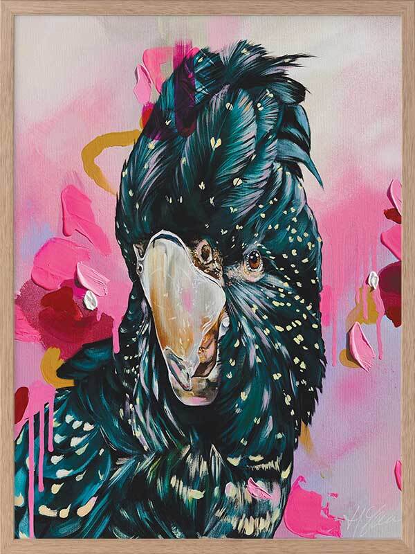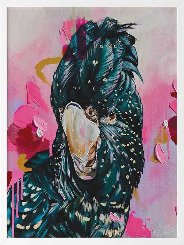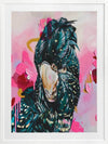 Eternal Love Framed Art Print - Eternal love is exactly what we feel for this cheeky, intelligent Australian black cockatoo, with its playful gaze and remarkable beauty. The vivid and warm pink backdrop, with spray paint drips and random brush strokes, tells us a lot about its charming, joyous personality - a beautiful contrast against its regal blue-toned feathers.