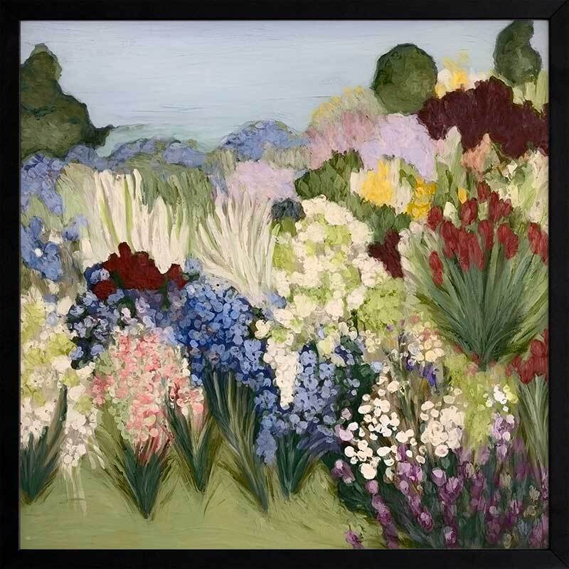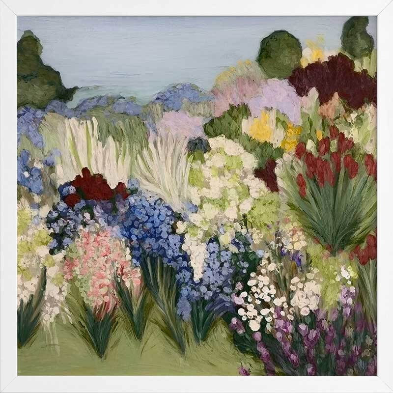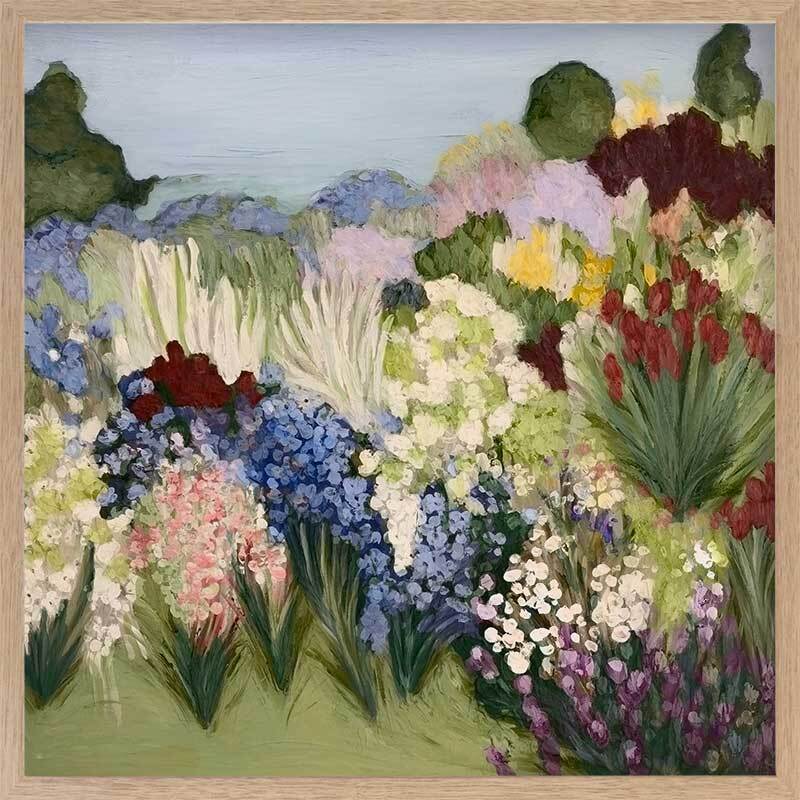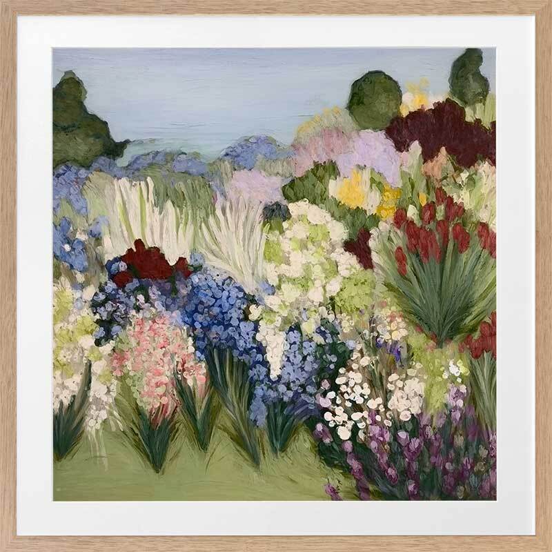 Ethereal Escape Framed Art Print - This floral wall art captures the fleeting moments of serenity as you walk through a blossoming garden, surrounded by blue, purple, red, yellow, and off-white flowers blooming in all their beauty below a baby blue sky. Evoking feelings of calm, this piece is ideal as a pop of colour for any space.