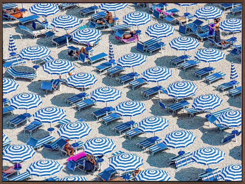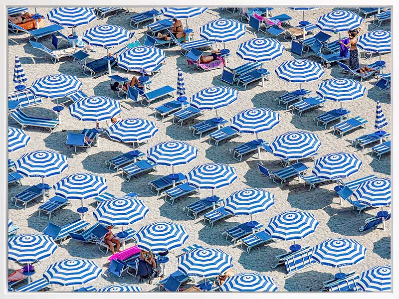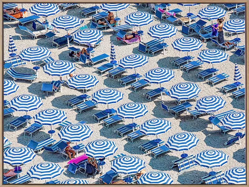 European Summer - An aerial photograph of rows and rows of blue and white striped umbrellas on a sandy shore. Photographed by Ricardo Gomez Angel.