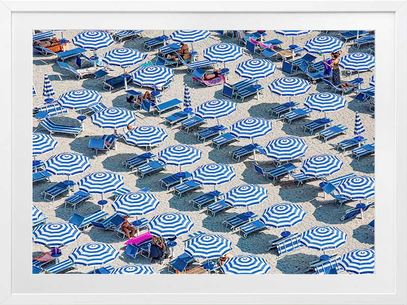European Summer - An aerial photograph of rows and rows of blue and white striped umbrellas on a sandy shore. Photographed by Ricardo Gomez Angel.