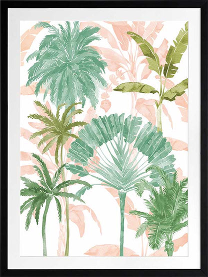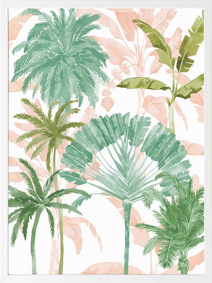 Exotic Palms II Poster Print. This pastel art piece Exotic Palms II is a bright and cheerful image showing a variety of tropical plants in pastel pinks and greens. Pairs with Exotic Palms I Poster Print.