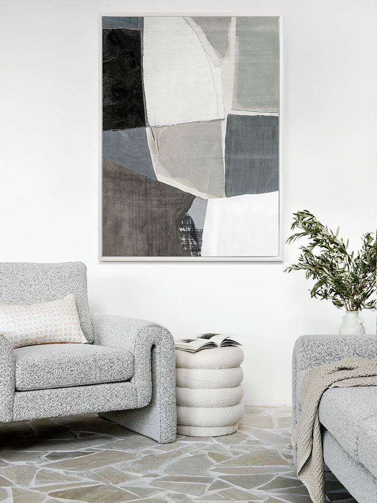 Faded Memories II Canvas Art Print - This abstract artwork, a symphony of monochrome shades, brings a touch of mid-century modern elegance to any space. With its harmonious blend of black, white, and grey hues, and fluid, organic shapes, this wall art evokes a fresh, calming vibe - perfect for enhancing any living room or bedroom.