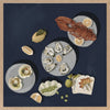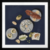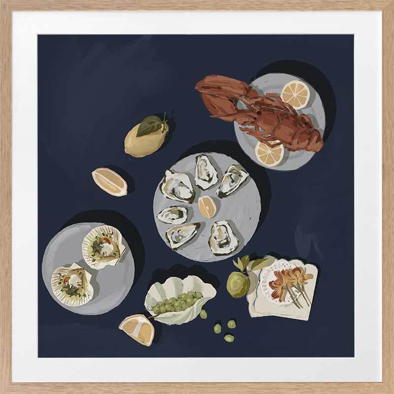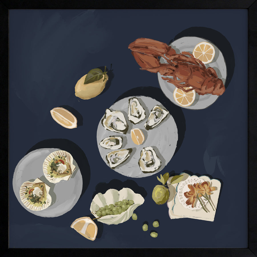 Family Gathering Deep Blue Framed Art Print - Family gathers for an afternoon alfresco picnic, full of overflowing seafood platters, from oysters, to crayfish, scallops, and more. A gorgeous still life piece capturing a moment in time, with a cool-toned deep blue backdrop that makes red, yellow, grey, green and white shades pop in the foreground.