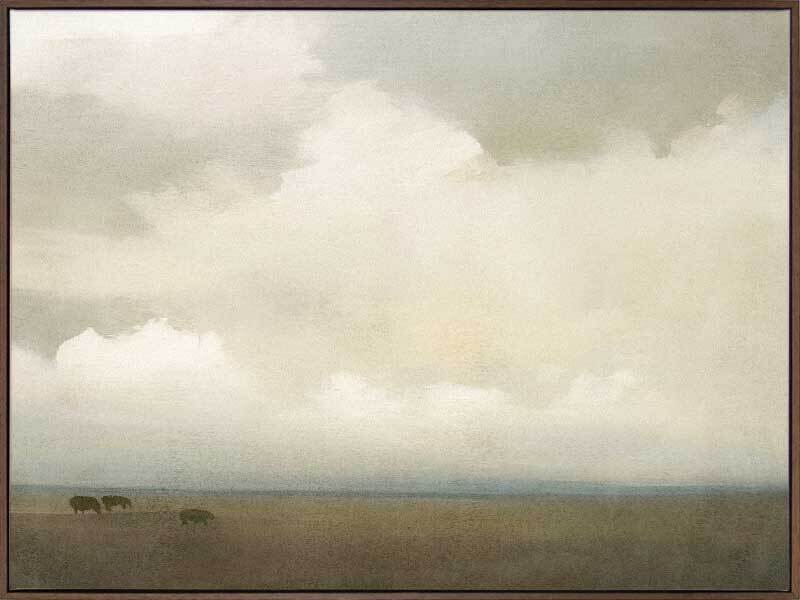 Farm Clouds Canvas Art Print - Let your soul wander into the warm, tranquil energy of this stunning landscape wall art, featuring a cloudy sky overlooking farmland, a few animals out to graze at dawn. A palette of soft cream white shades, greens, and a hint of blue make this a highly versatile piece for any space.