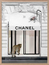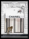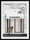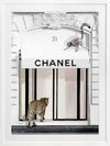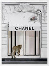 Fashion Week Framed Print: A whimsical art print that features a leopard and a lemur at a Chanel storefront. 2020 AUTUMN/WINTER COLLECTION: REVERIE