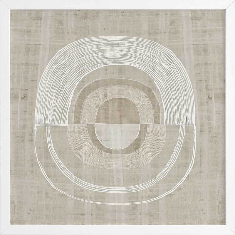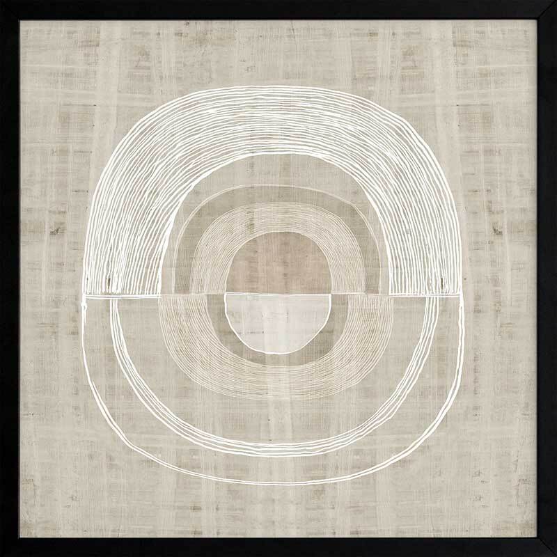 Fawn Sunrise Framed Art Print - Textural and symmetrical, this eye-catching piece shows a circular form filled in with curved line detailing over a thatched textural background in shades of lightest fawn and white. Marvelous in its simplicity, pair with Fawn Sunset for a dramatic wall effect that's effortlessly chic.